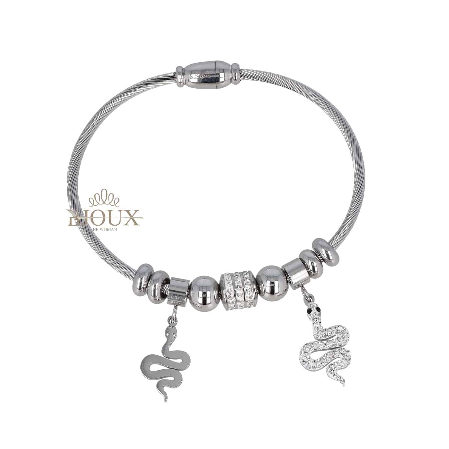 Bracciale bigiotteria in acciaio inossidabile con chiusura a calamita. Decoro di zirconi con pendenti a forma di cobra.