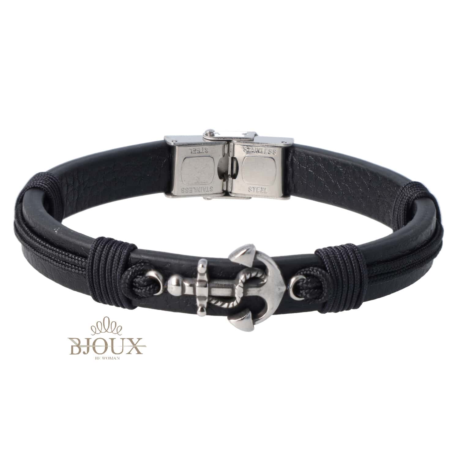Bracciale di bigiotteria in pelle nera da uomo. Bracciale con intreccio e centrale acciaio inossidabile