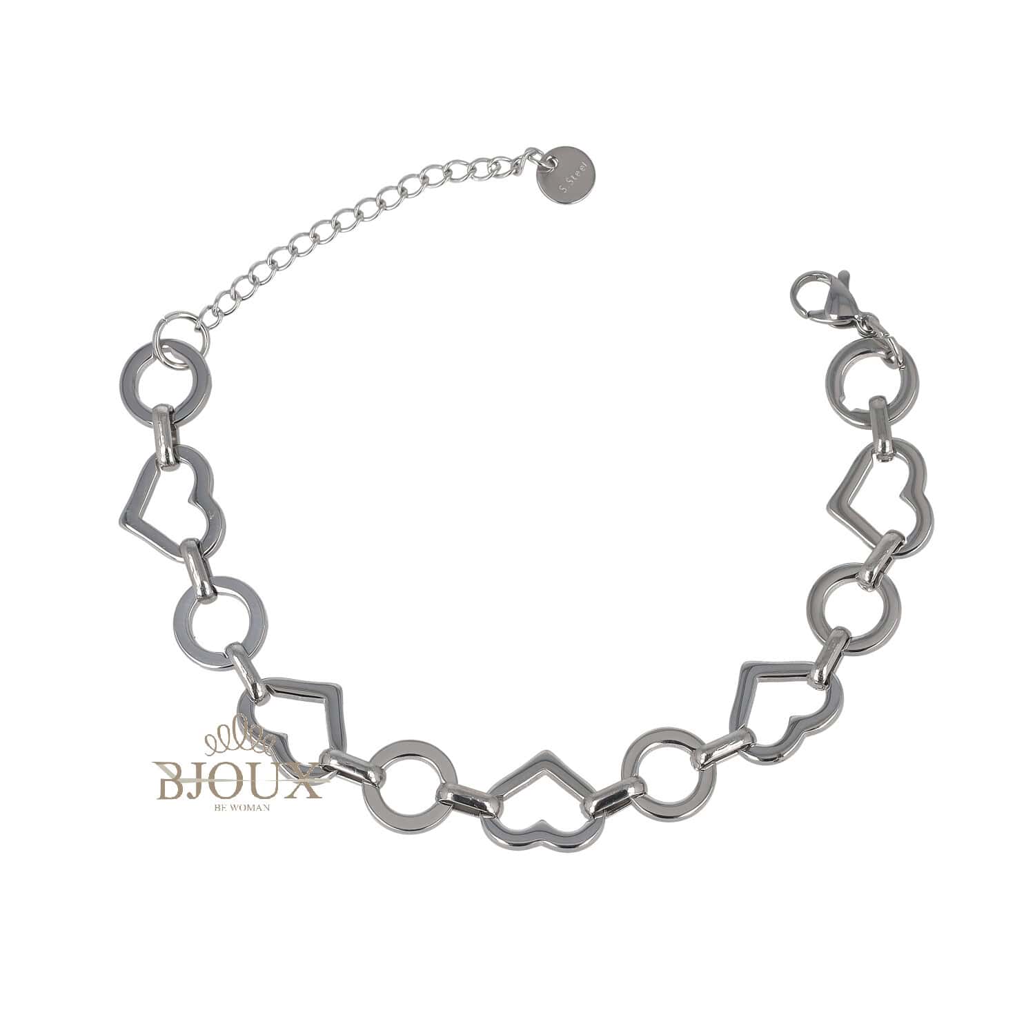 Catena alternata da cerchi e cuori stilizzati, per un bracciale moderno e romantico. Un accessorio leggero, versatile e perfetto da abbinare ad altri gioielli.