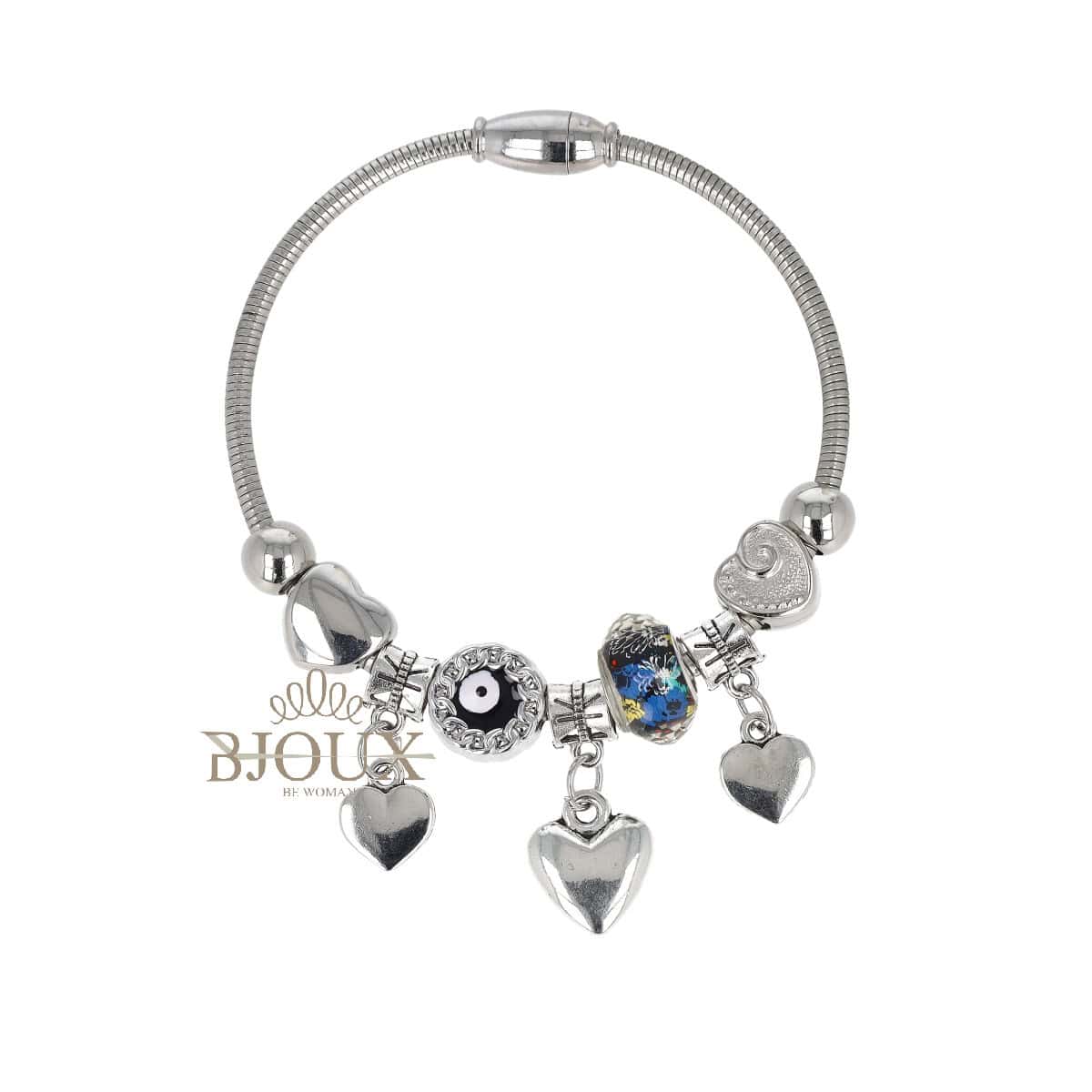 Bracciale in ottone anallergico modello semirigido con chiusura calamita con beads colorati , occhio e charms cuori