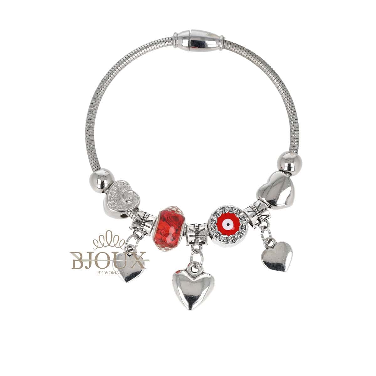 Bracciale in ottone anallergico modello semirigido con chiusura calamita con beads colorati , occhio e charms cuori