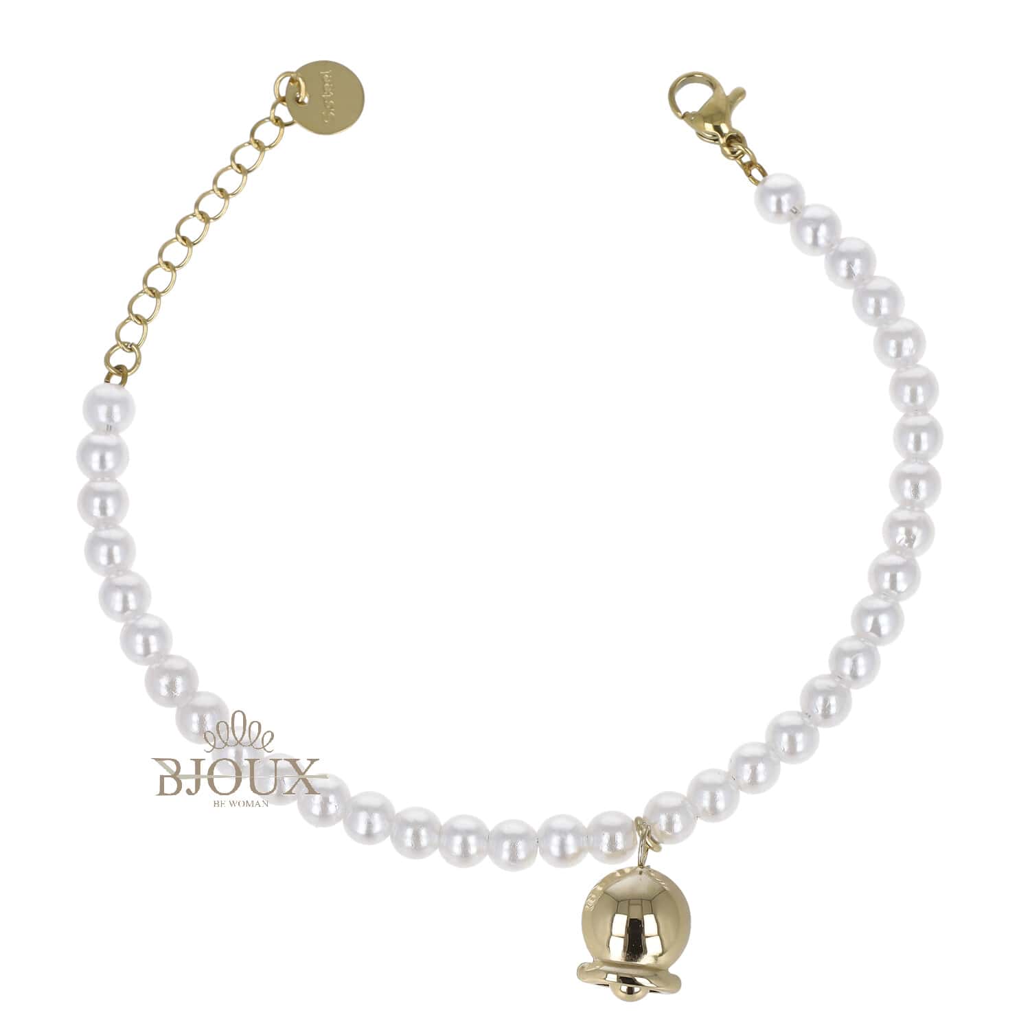 Bracciale di bigiotteria in perle bianche con perdente campanella Capri da 1,5 cm in acciaio