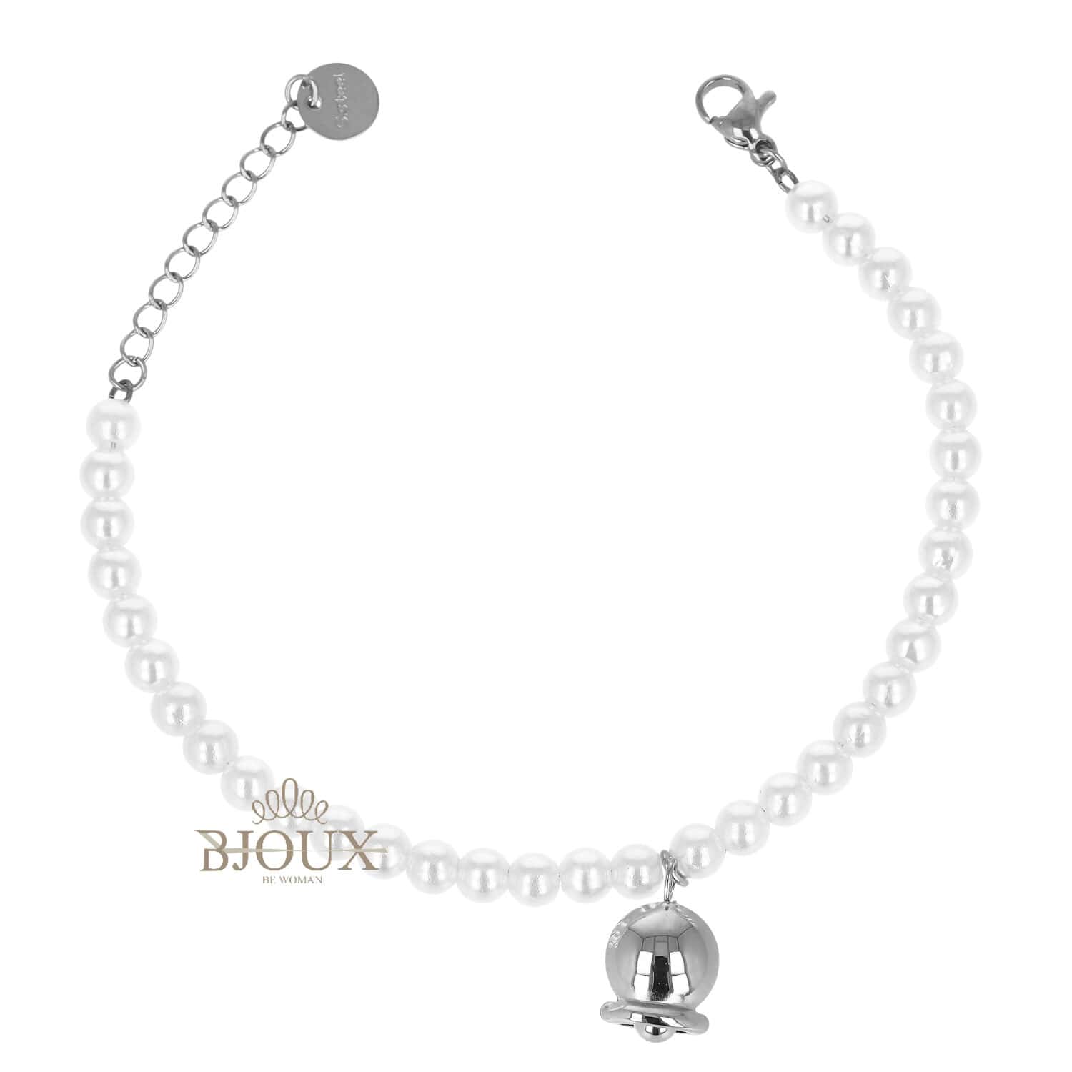 Bracciale di bigiotteria in perle bianche con perdente campanella Capri da 1,5 cm in acciaio