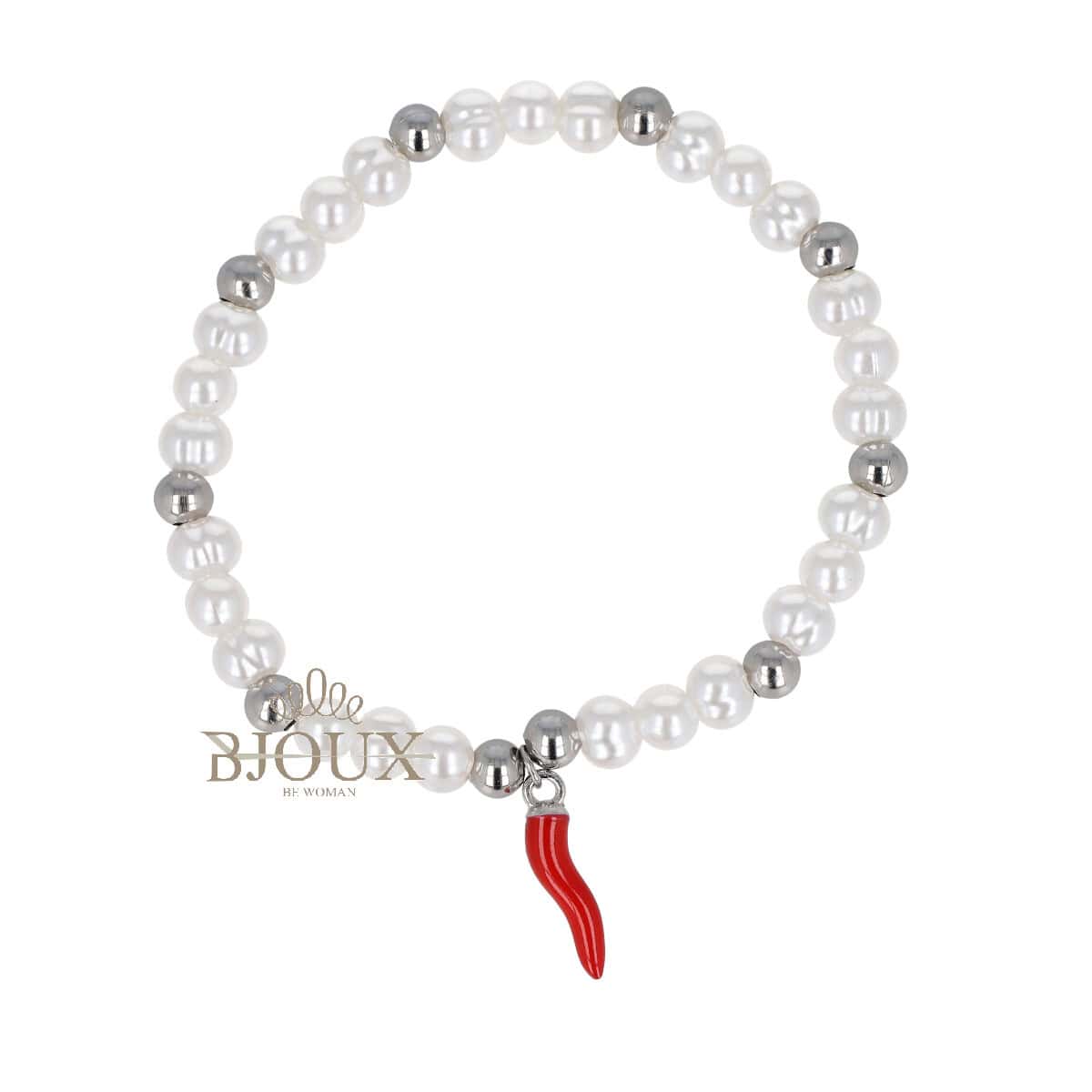 Bracciale in acciaio inossidabile elastico composto da perline con ciondolo centrale corno rosso pendente.