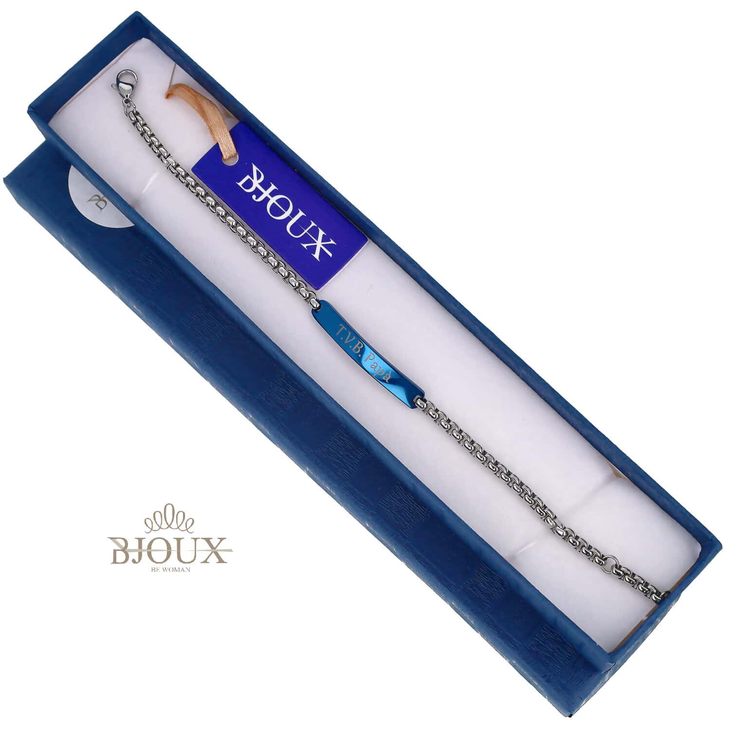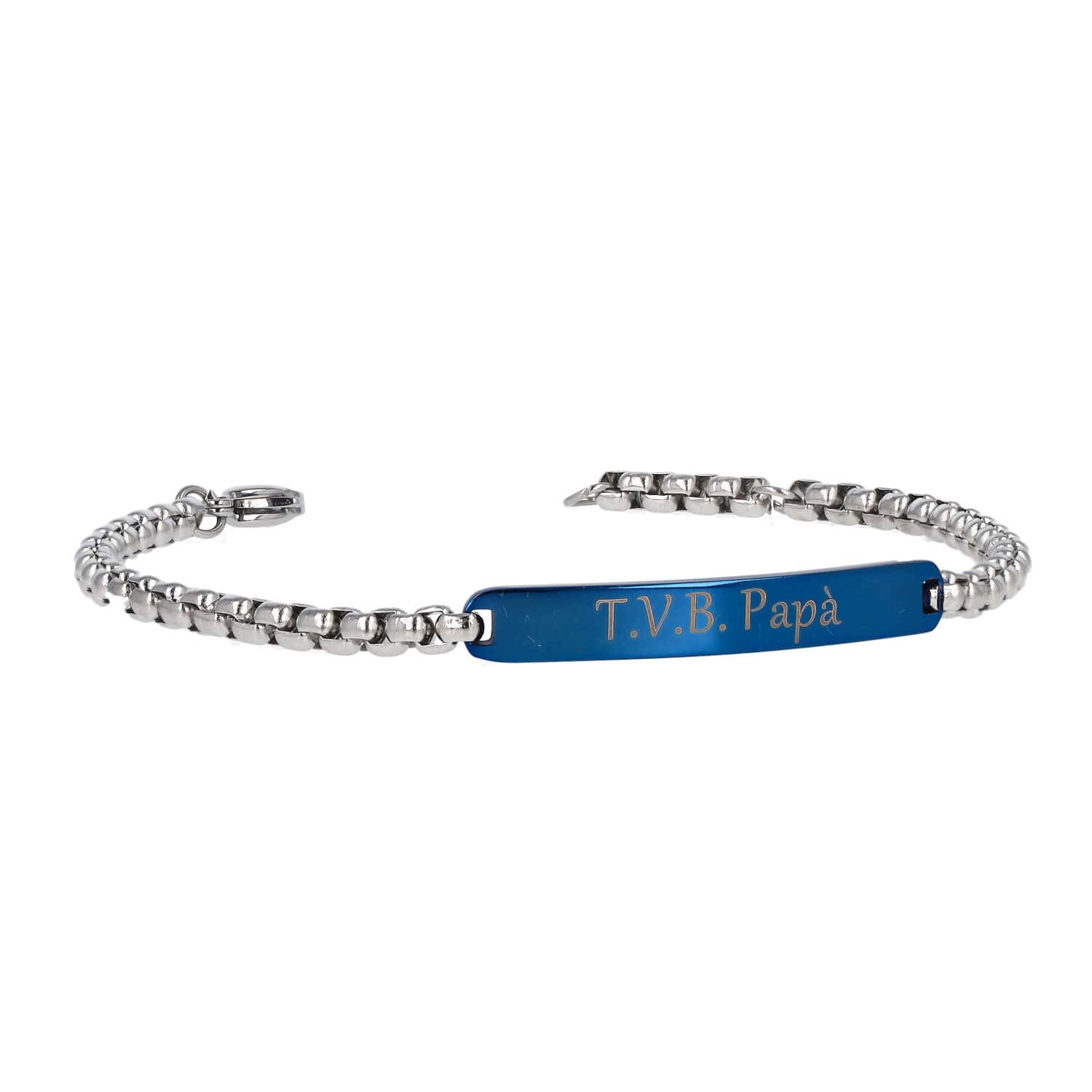 Bracciale da uomo in acciaio inossidabile. Misura 20 cm. Catenina con targhetta da 4 cm centrale blu con scritta TVB Papà Con Astuccio regalo 21×5 cm blu