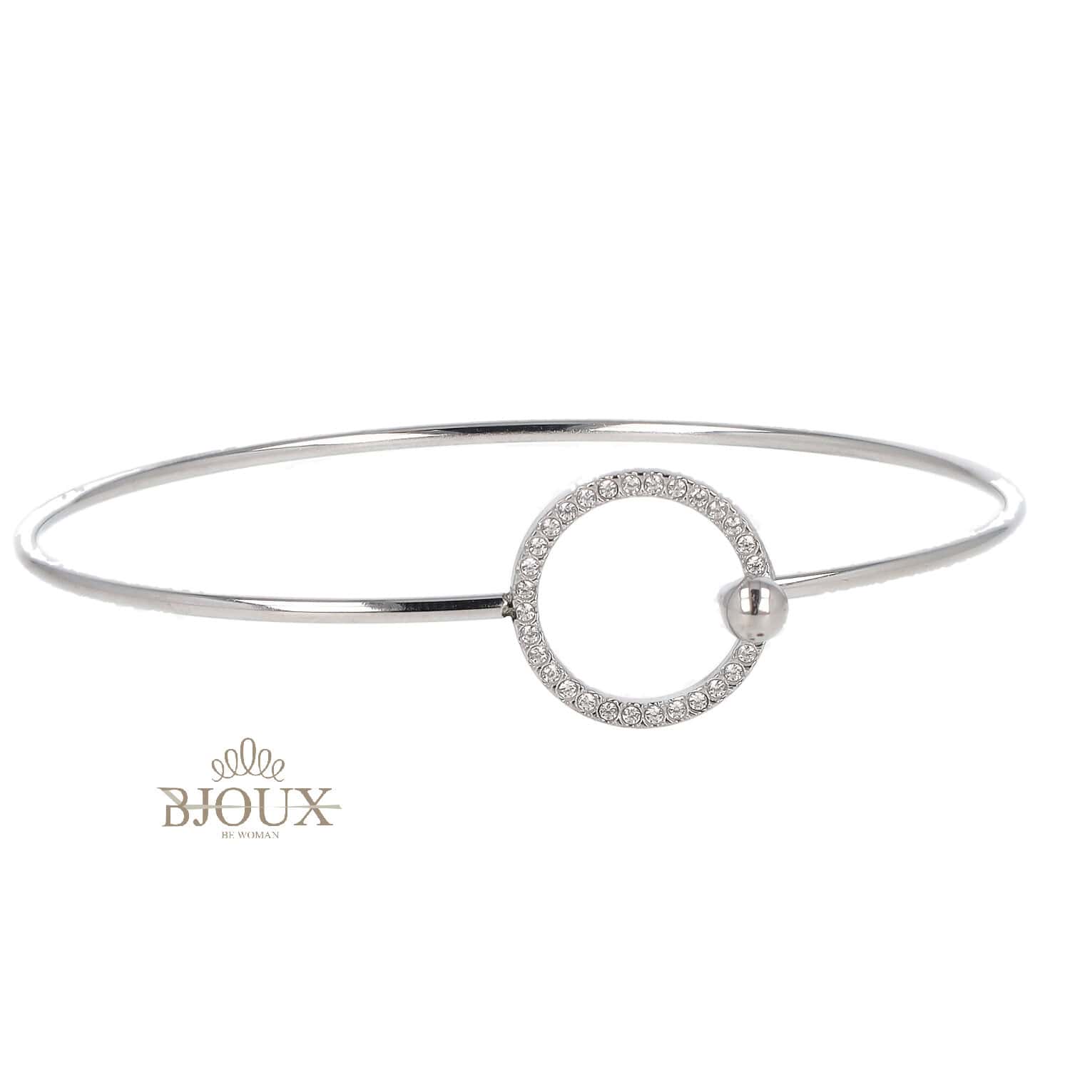 Bracciale rigido in acciaio inox, disponibile in finitura oro e argento, con cerchio centrale decorato da zirconi. Minimal e raffinato, ideale per outfit eleganti.