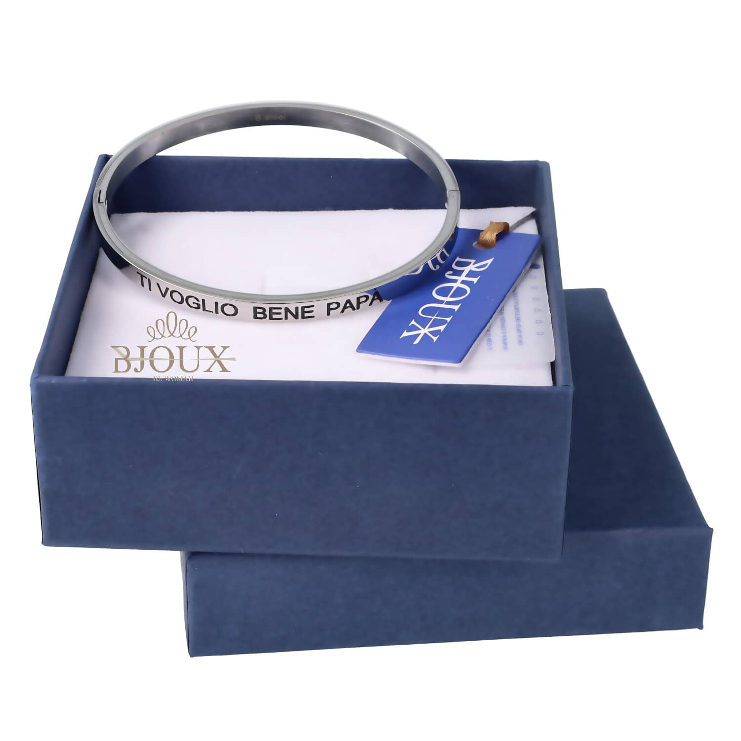 Bracciale in acciaio inossidabile a manetta con frase centrale dedicata al papà. Colore rodio. Completi di astuccio regalo 7×7