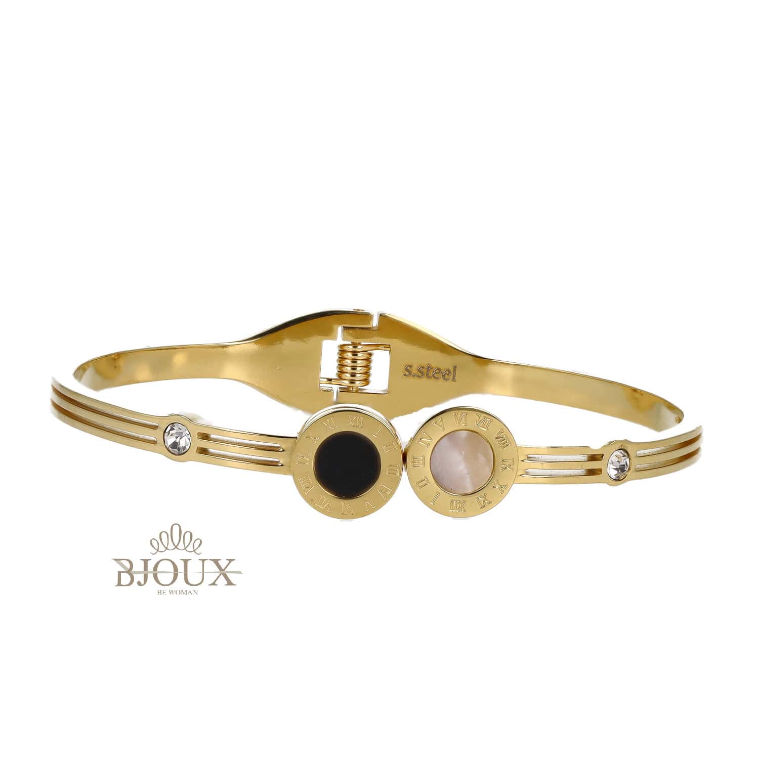 Bracciale di bigiotteria da donna in acciaio inossidabile chiusura a scatto con madreperla, pietra nera e zirconi
