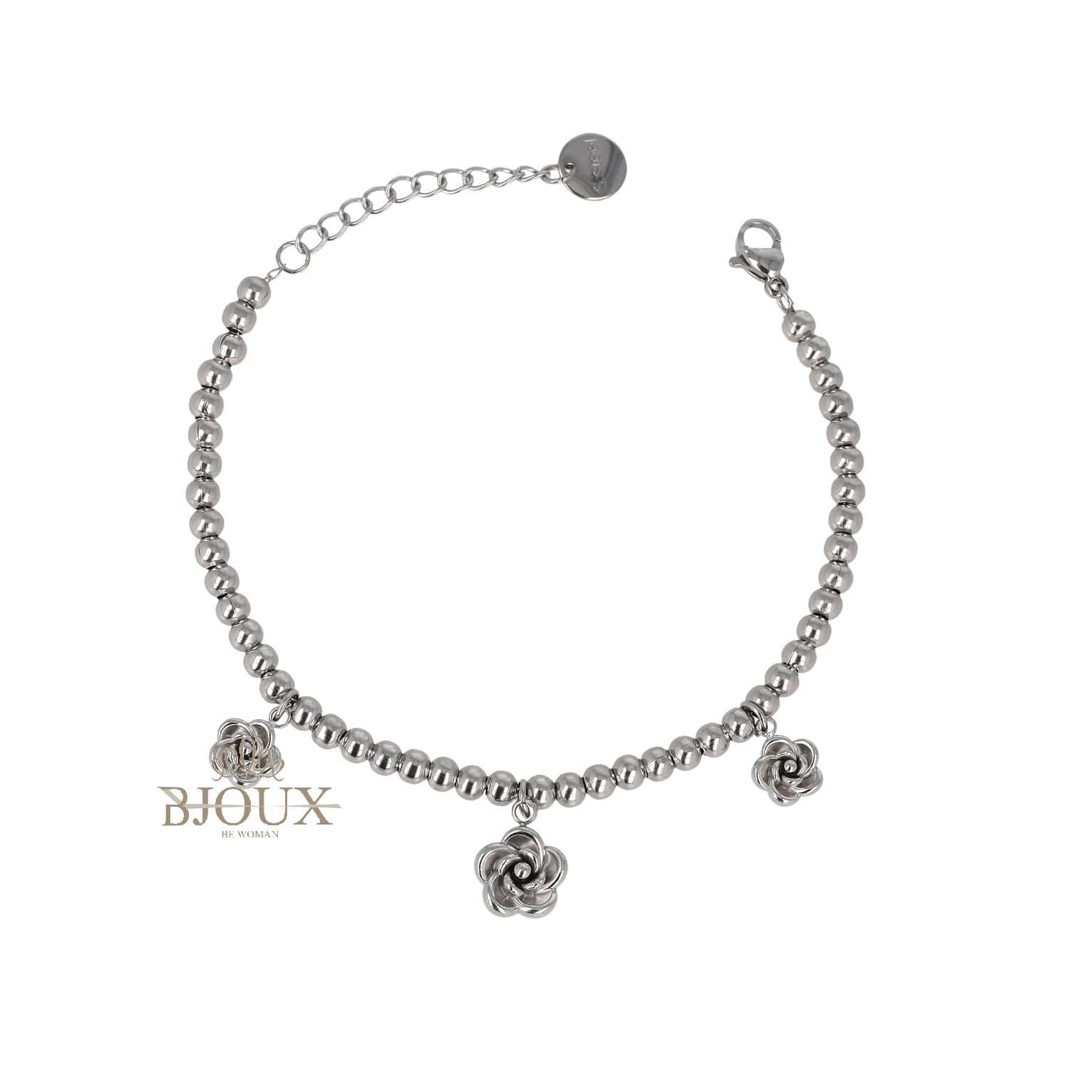 Sfere in acciaio alternate a piccoli charm a forma di rosa. Un gioiello versatile, da indossare sia singolo che in combinazione con altri bracciali.