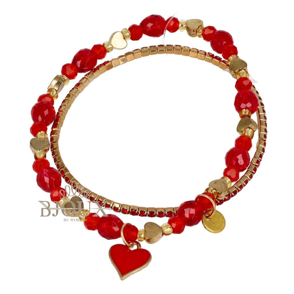 Bracciale elastico con corallini rossi, cuoricini dorati e cuoricino pendente, abbinato a un tennis con strass rossi. Un mix romantico e festivo che illumina il polso.