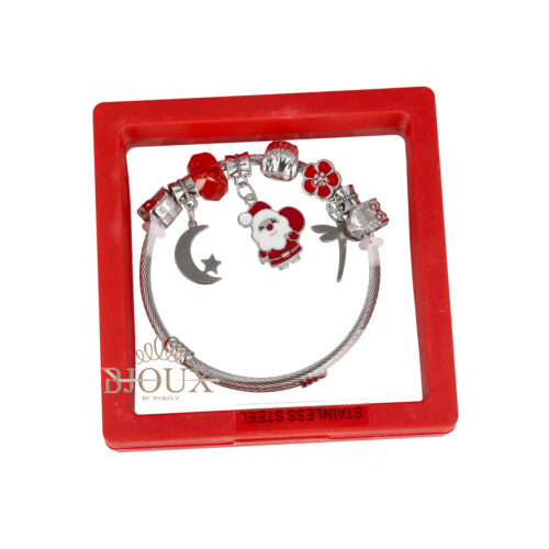 Bracciale rigido a spirale decorato con charms vari in colore rodio, beads rossi e ciondolo pendente a tema Natalizio. Contenuto in astuccio regalo 9×9 rosso con vetrina trasperente