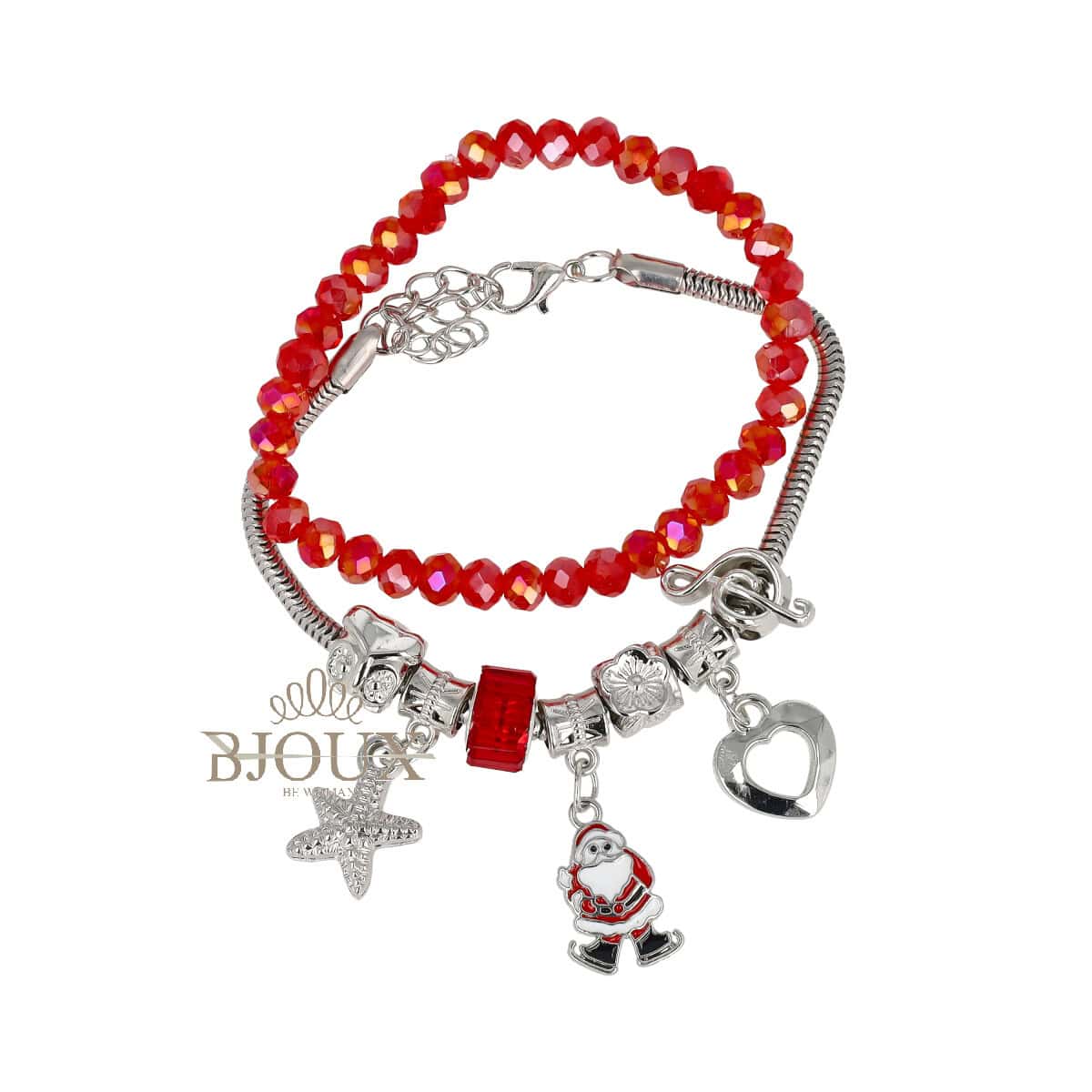 Bracciale coda di topo con catenella regolabile decorato con charms vari in colore rodio, beads rossi e ciondolo pendente a tema Natalizio, con bracciale elastico di corallini rosso. Contenuto in astuccio regalo 9×9 rosso con vetrina trasperente