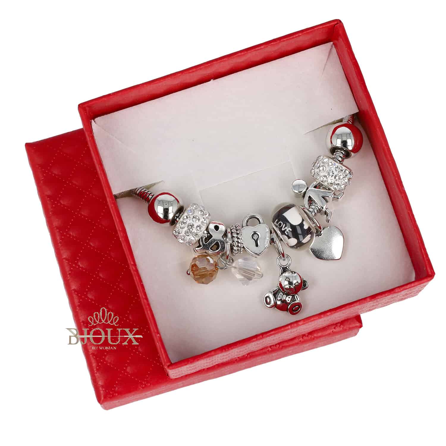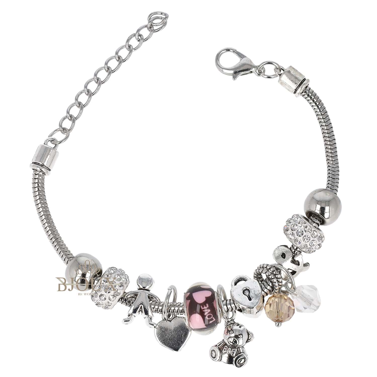 Bracciale in ottone a misura regolabile coda di topo rodiata, charms assortiti, beads con strass. Completo di astuccio regalo 7×7