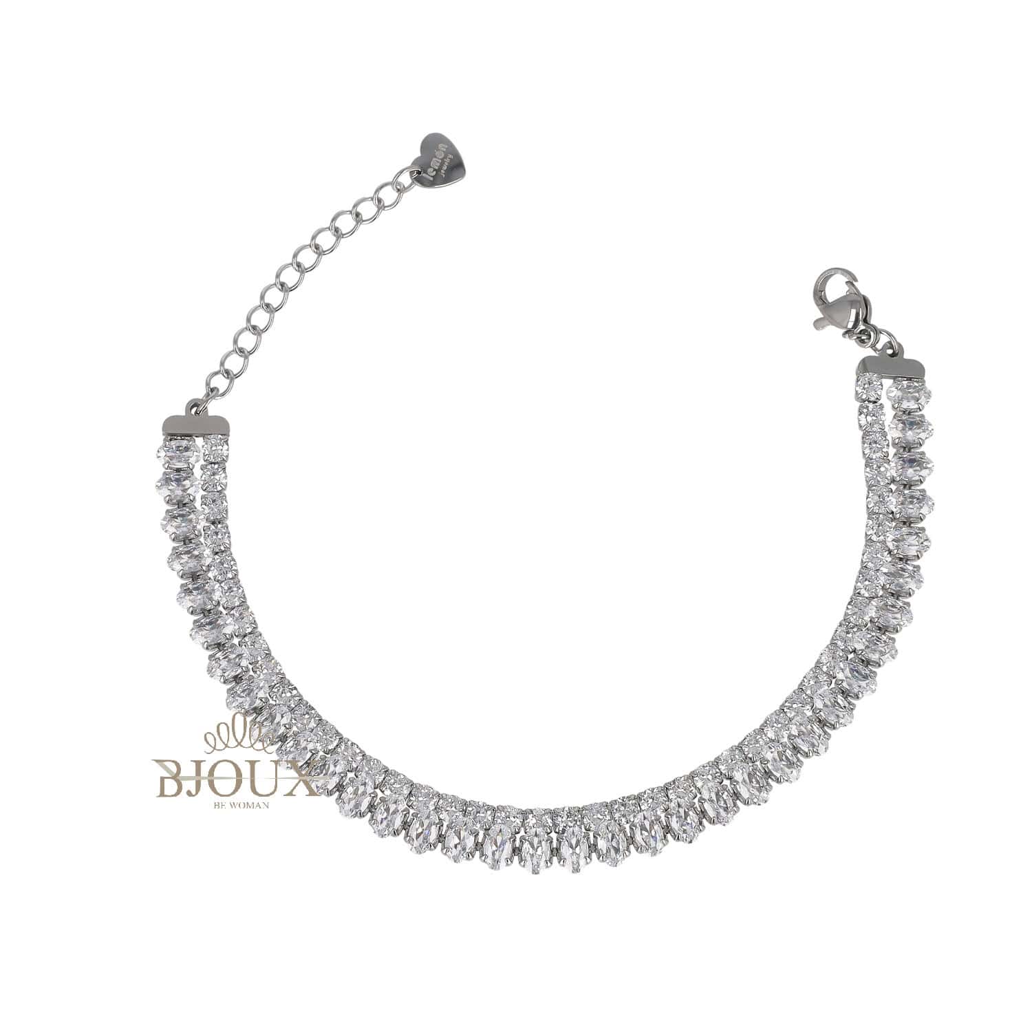 Bracciale tennis con zirconi luminosi a lavorazione fitta, raffinato ed elegante. Una linea di zirconi a goccia e l’altra con zirconi tondi