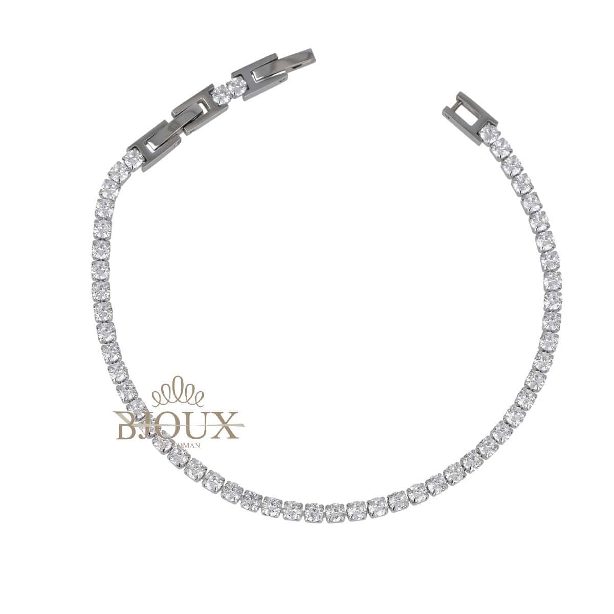 Bracciale bigiotteria donna in acciaio inossidabile modello tennis con strass 2 mm colorati. Misura 18 cm regolabile grazie al doppio gancio.