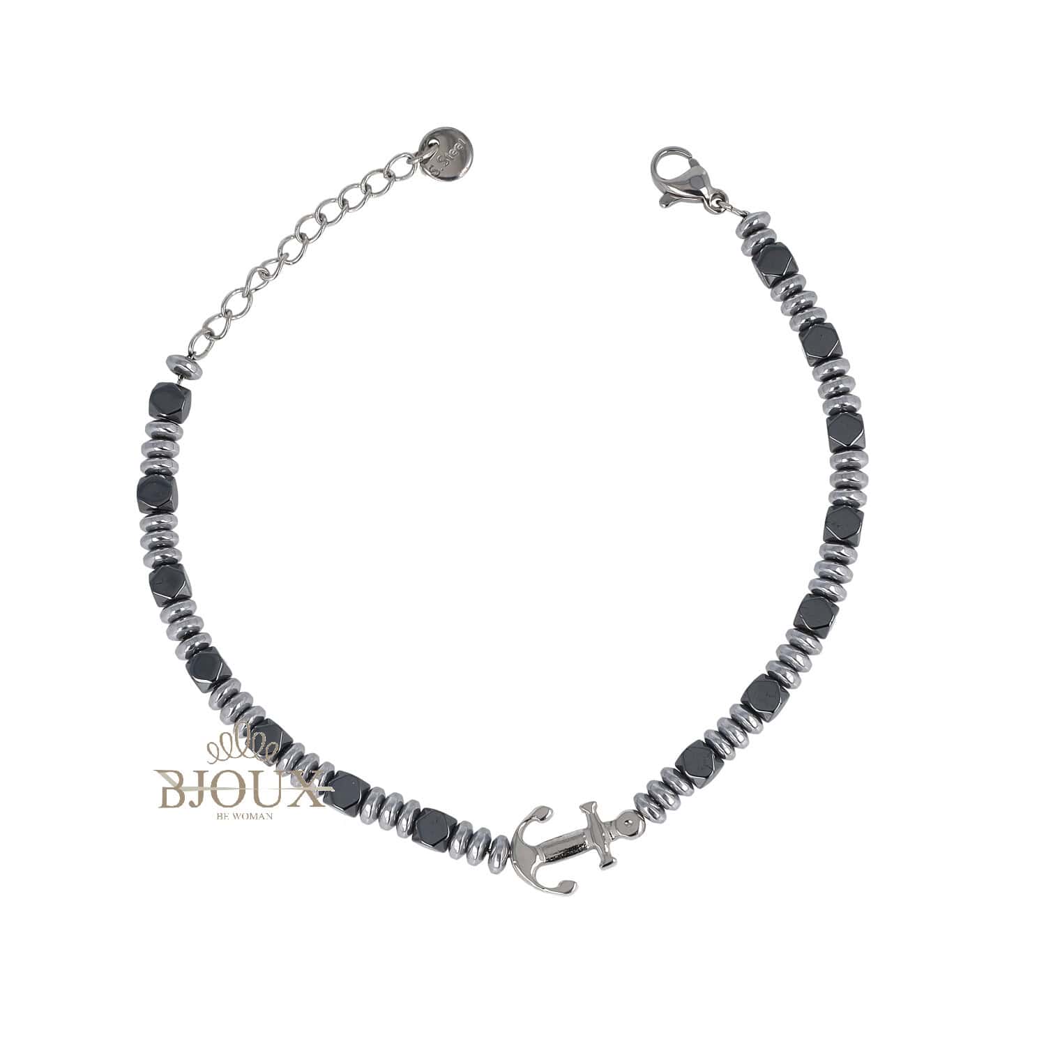 Versione più grintosa e contemporanea del bracciale con ancora, arricchito da elementi sfaccettati e anelli metallici che creano un effetto dinamico
