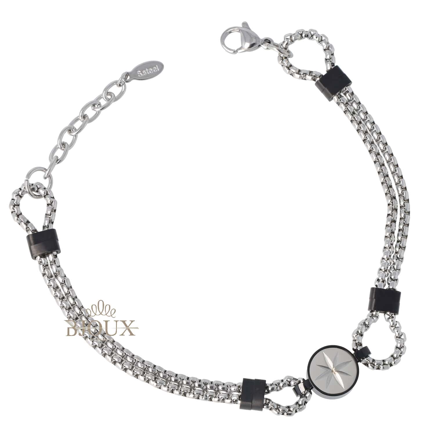 Bracciale bigiotteria in acciaio inossidabile rodiato a catena die fili, con centrale bussolotto black e rosa dei venti