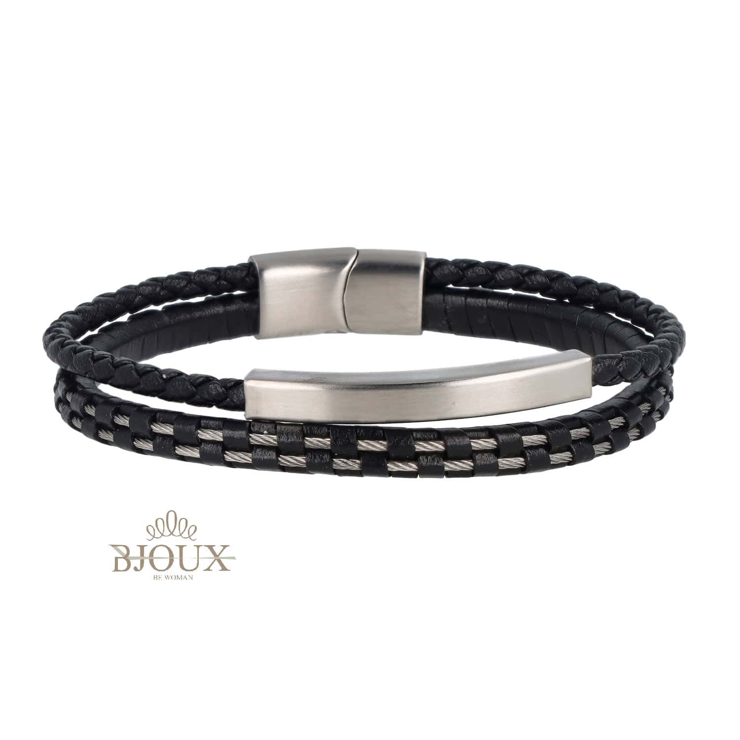 Bracciale con intreccio nero, arricchito da un motivo intrecciato a contrasto in acciaio e pelle. La barra centrale in acciaio lo rende elegante e versatile, unendo stile casual e moderno.