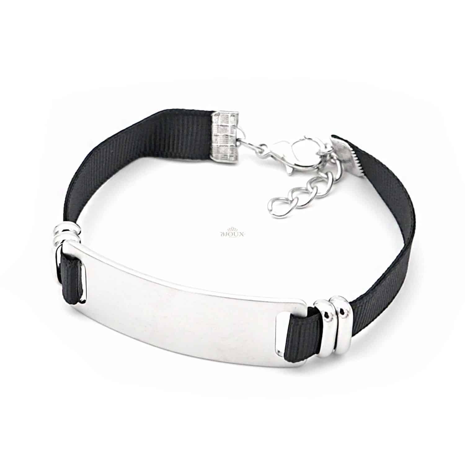 Bracciale bigiotteria da uomo in tessuto di colore nero, con applicazione metallica rodiata e satinata.