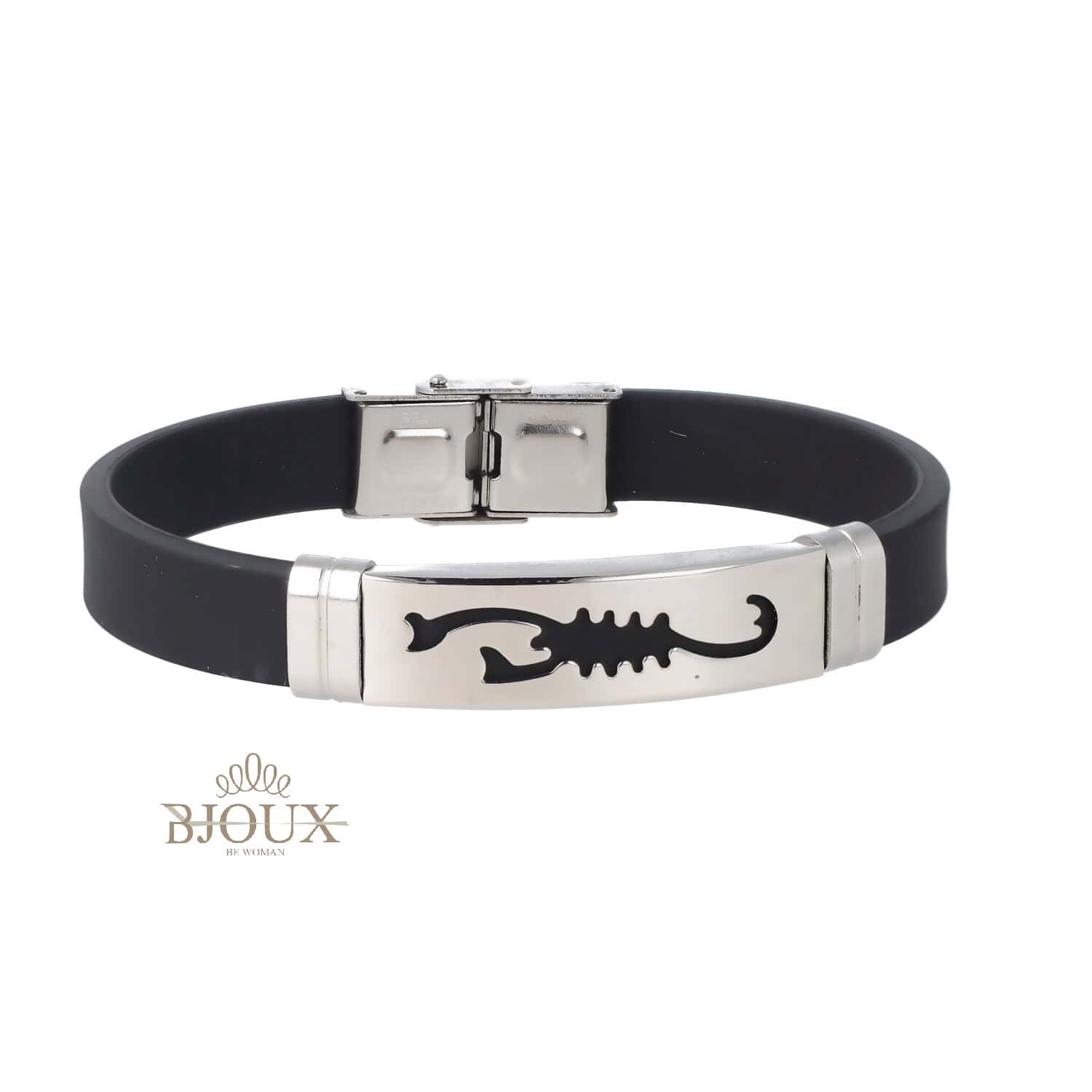 Bracciale uomo in silicone nero con piastra acciaio e scorpione nero intagliato. Grintoso e d’impatto.