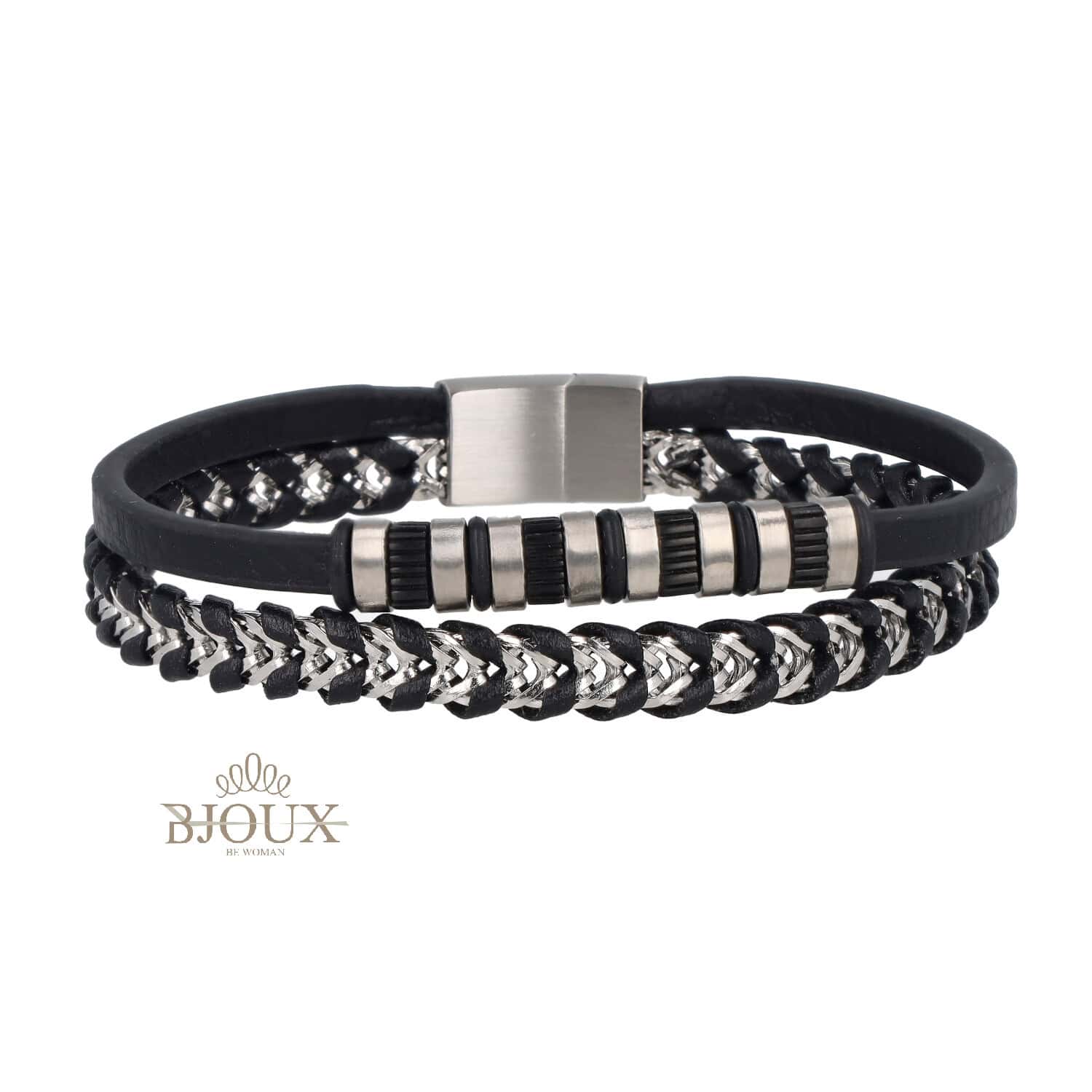 Bracciale dal look grintoso e contemporaneo, con doppio intreccio nero e dettagli centrali in acciaio con inserti neri. Perfetto per chi cerca un bijoux con carattere e personalitร .