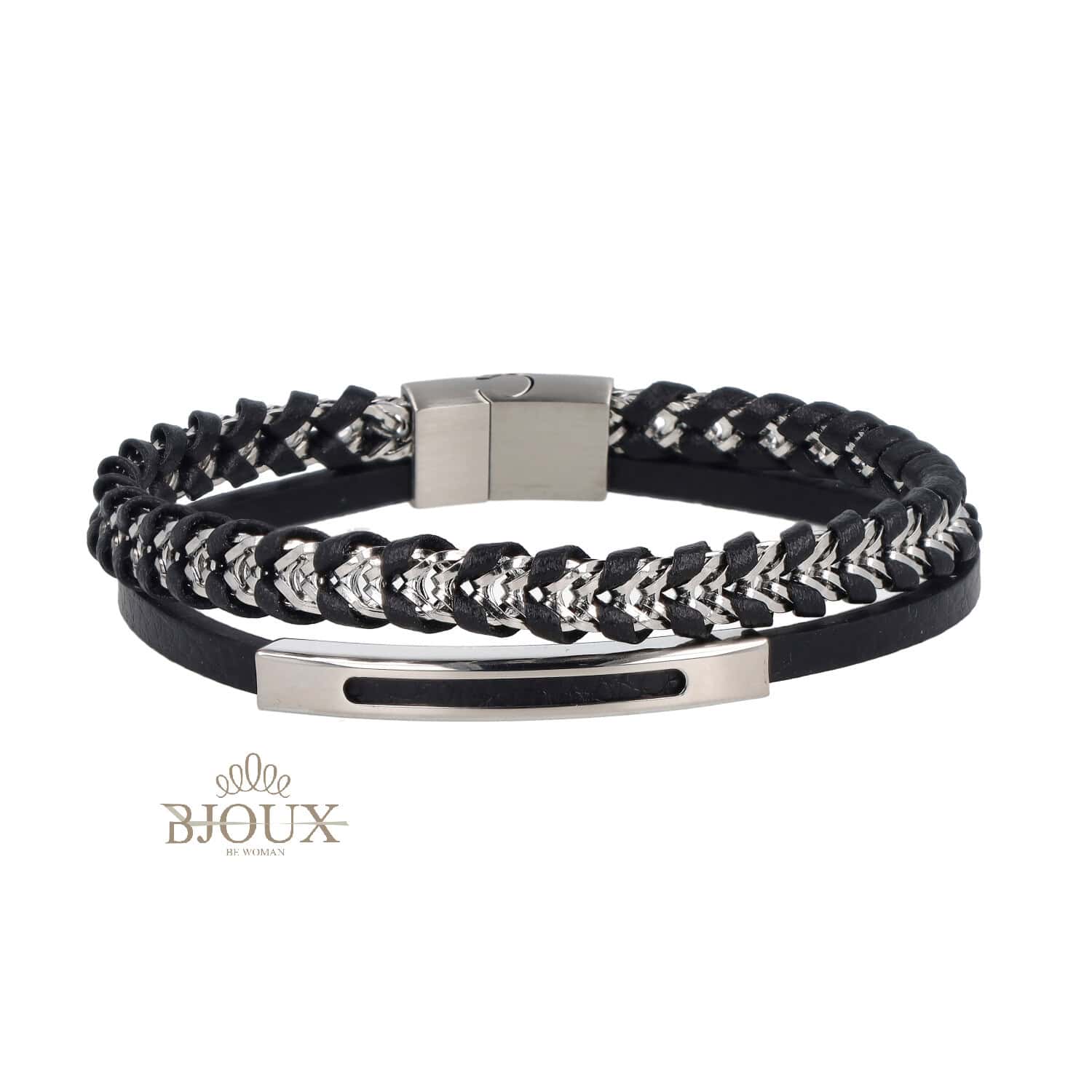 Bracciale multistrato con doppio intreccio nero e dettagli in acciaio. Il design moderno è arricchito da una barra centrale in acciaio satinato. Un bijoux dallo stile urbano e deciso, ideale per l’uso quotidiano.
