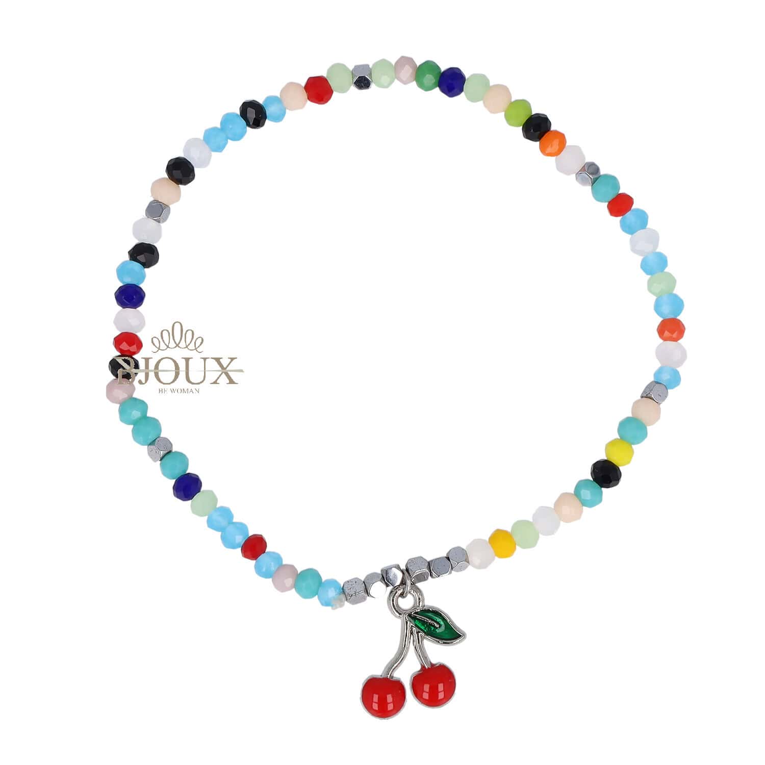 Braccialeย elastico con pendente ciliegieย smaltate composto da cristalli colorati