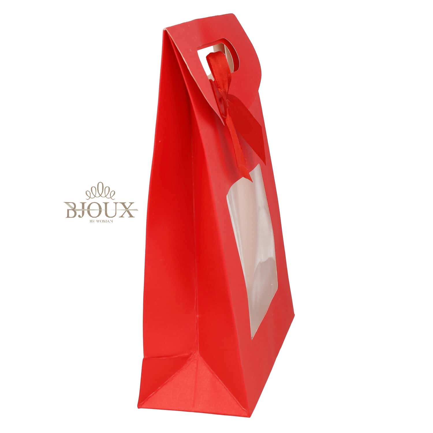 Busta regalo in carta Kraft colorata con chiusura a strappo e finestra trasparente. Fiocchetto colorato. Misura 15x6x21. Confezione da 6 pezzi
