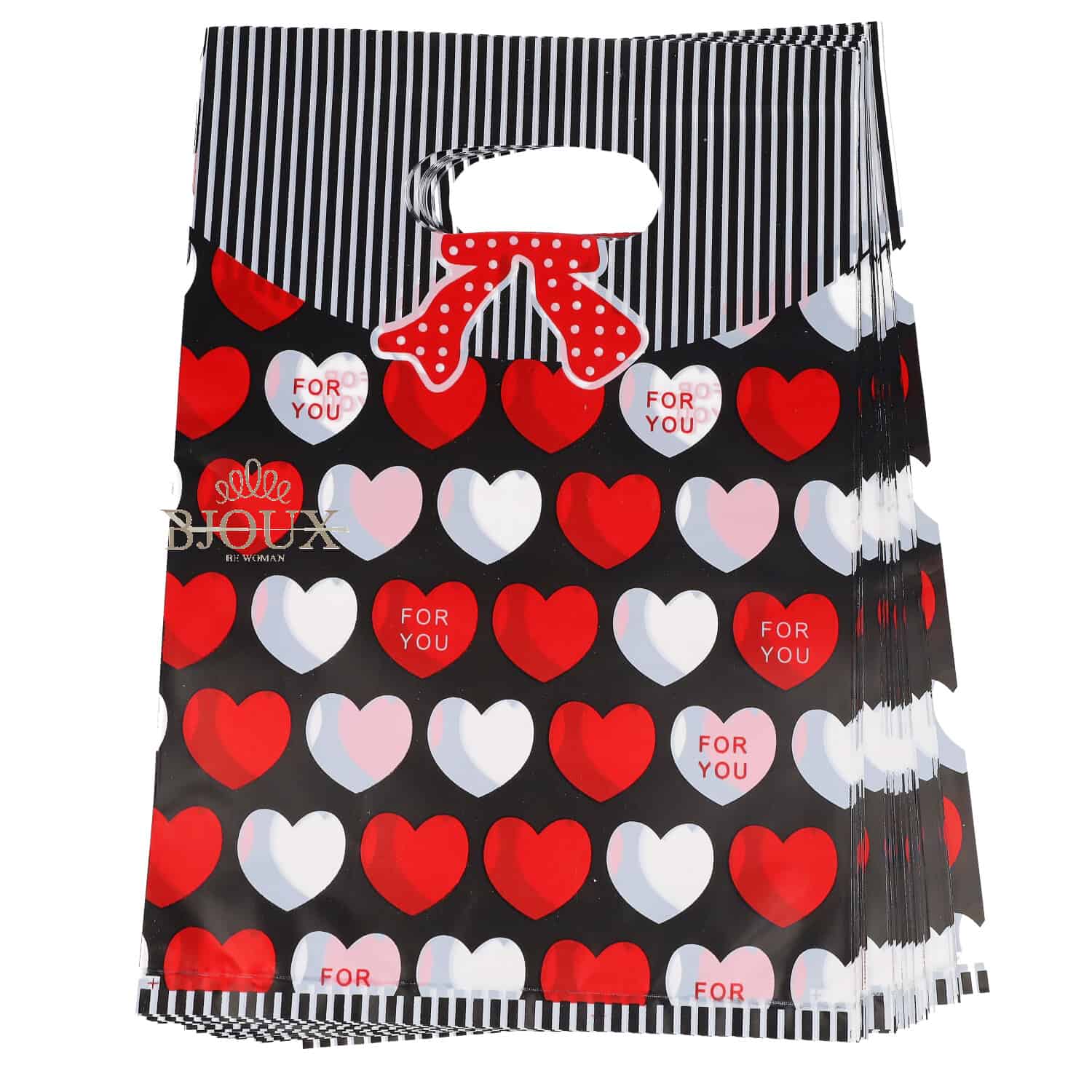 Sacchetti in plastica con decoro cuori rossi e bianchi. Misura 20×25. Confezione da 100 pezzi