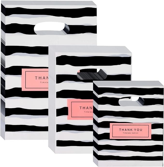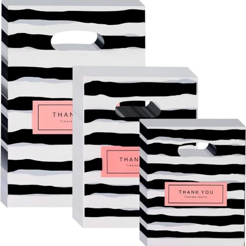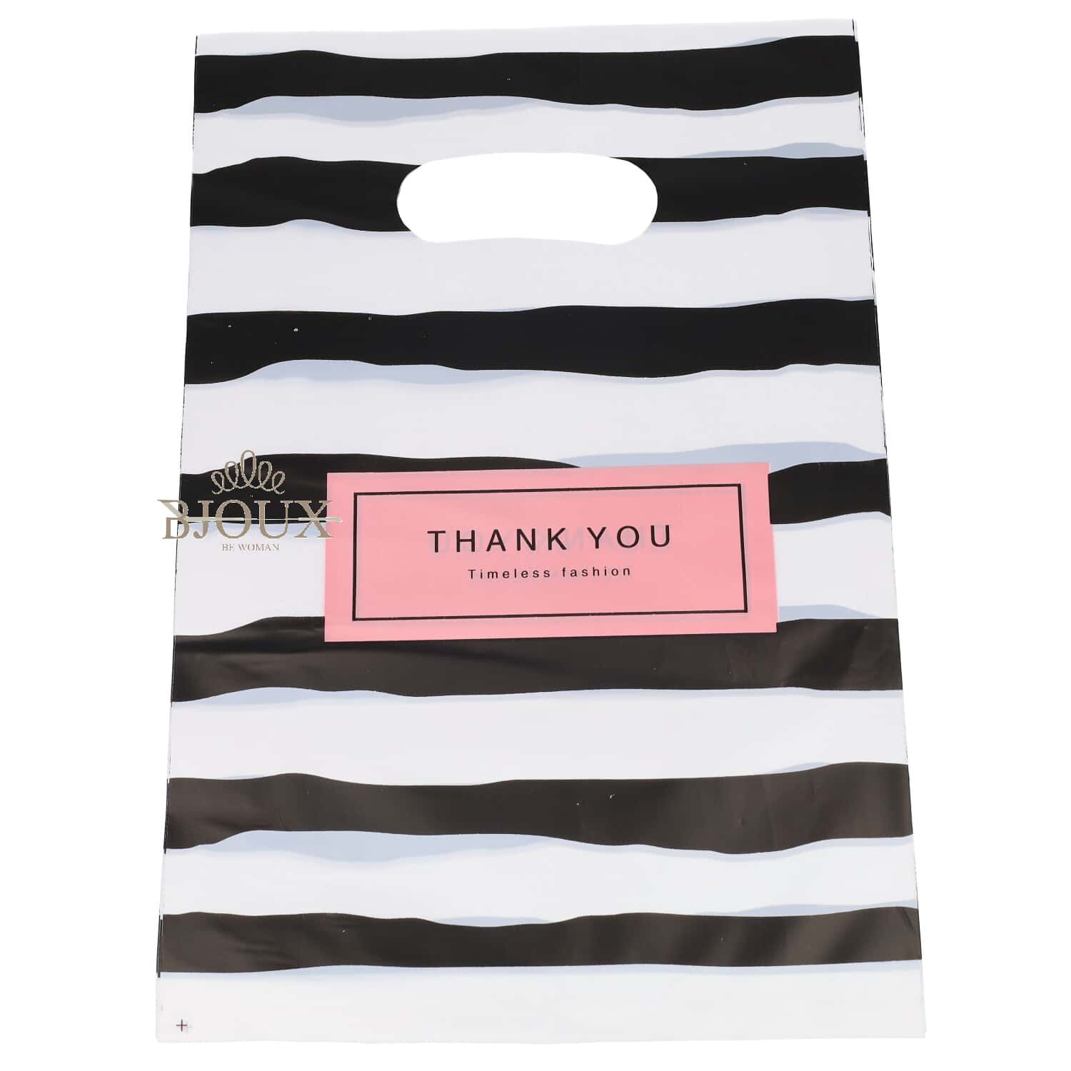 Sacchetti in plastica a strisce Bianche e Nere con scritta Thank You. Misura 20×30. Confezione da 100 pezzi