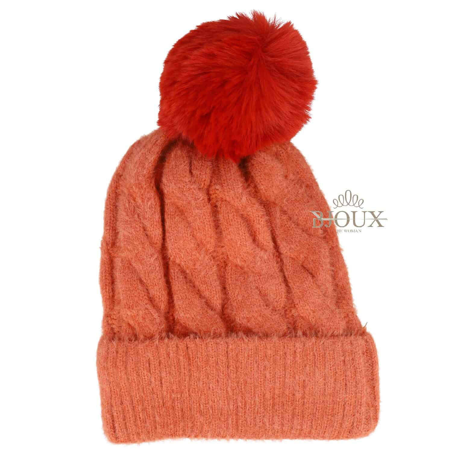 Cappello da donna in lana lavorazione a treccia con pon pon e rivestimento interno in pile. Taglia Unica. Composizione 80% viscosa 20% lana