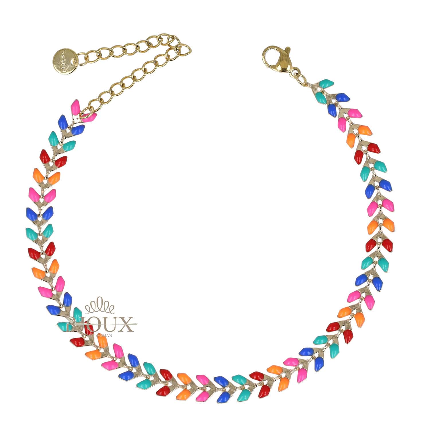 Cavigliera in acciaio con foglioline di alloro smaltate e colorate. Chiusura regolabile