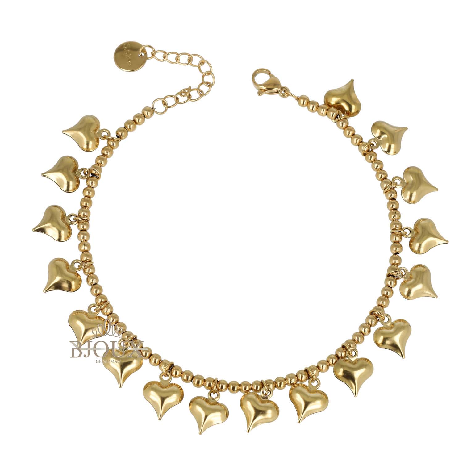 Cavigliera con catena a pallini in acciaio inossidabile, decorata da cuori da 0,9 cm. Misura 21+3 cm regolabile