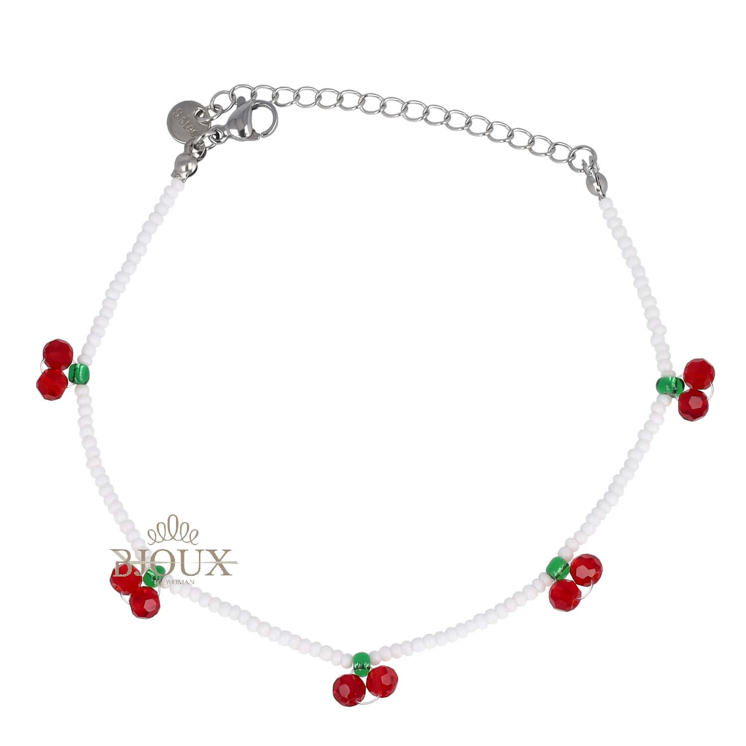 Cavigliera fashion in acciaio e conteria bianco con ciliegine rosse. Misura regolabile