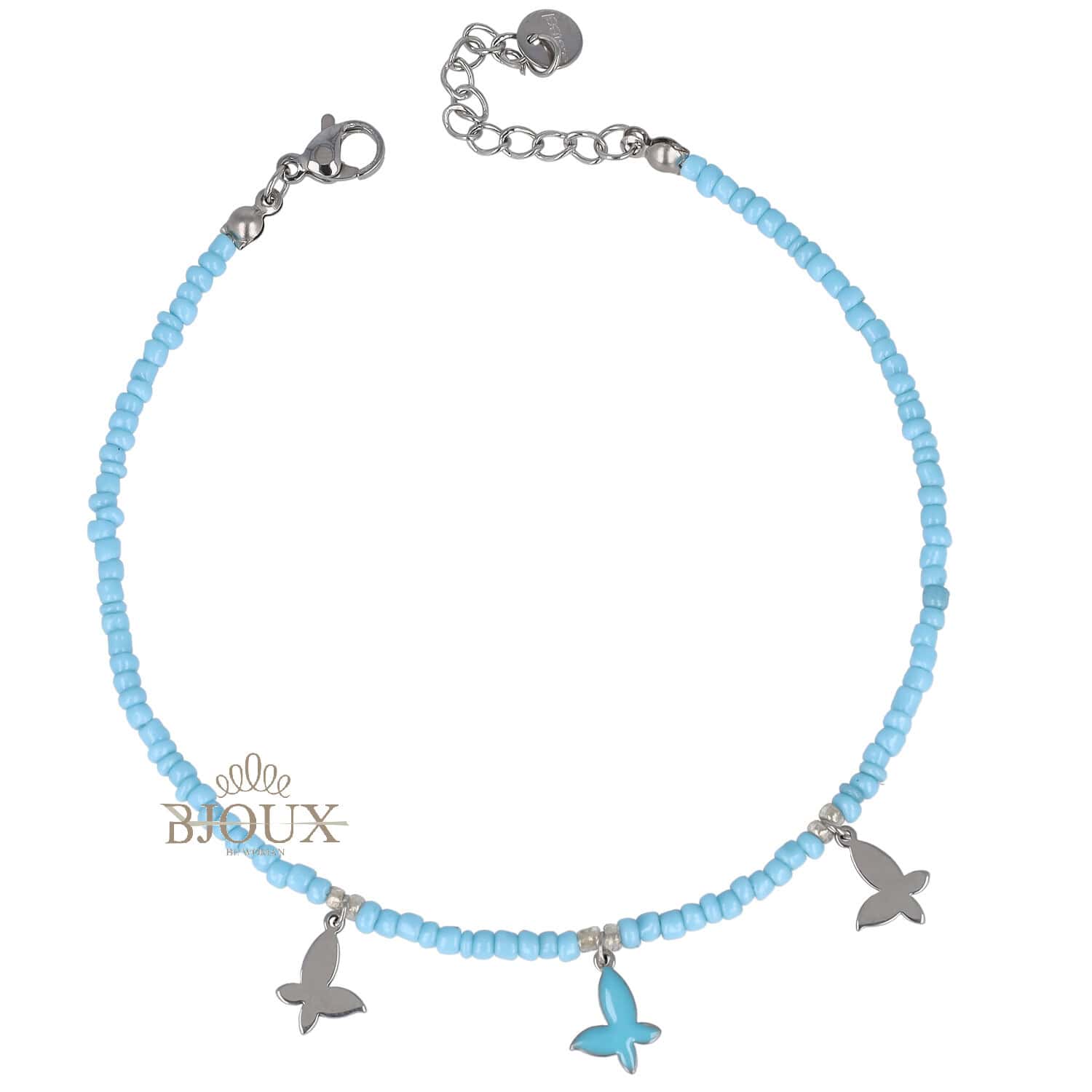 Cavigliera con chiusura in acciaio inossidabile con micro corallini colorati e tre farfalline