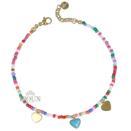 Cavigliera con chiusura in acciaio inossidabile con micro corallini colorati e tre cuoricini