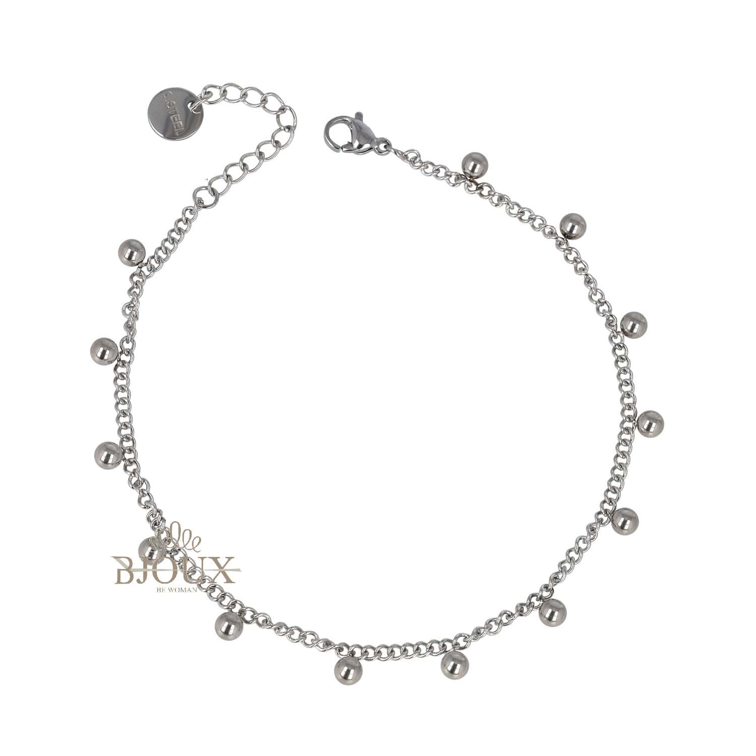 Cavigliera con catena in acciaio inossidabile, decorata da pallini pendenti. Misura 21+3 cm regolabile