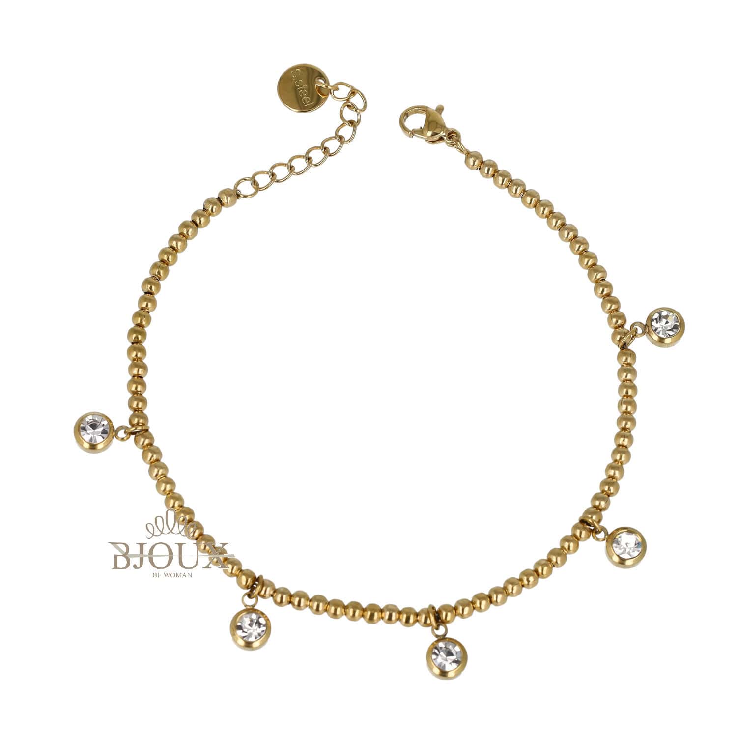 Cavigliera con catena a pallini in acciaio inossidabile, decorata da punti luce da 1 cm circa pendenti. Misura 21+3 cm regolabile