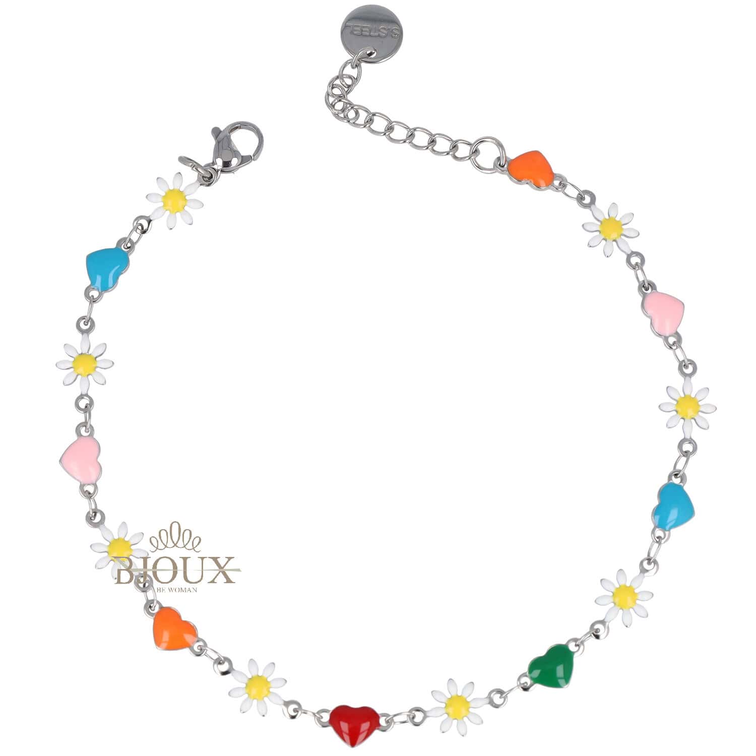 Cavigliera in acciaio inossidabile catena con estensione decorata da cuoricini smaltati colorati e margheritine