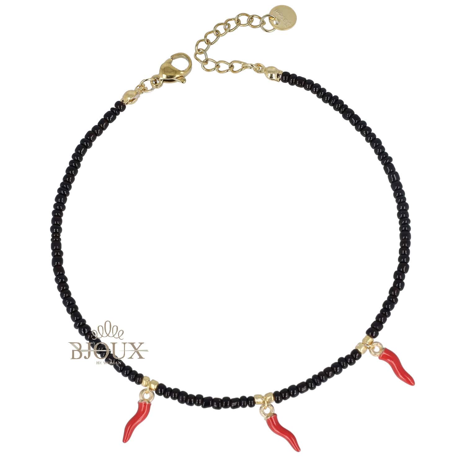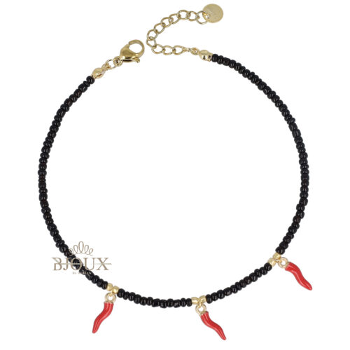 Cavigliera con chiusura in acciaio inossidabile con micro corallini colorati e tre corni rossi pendenti