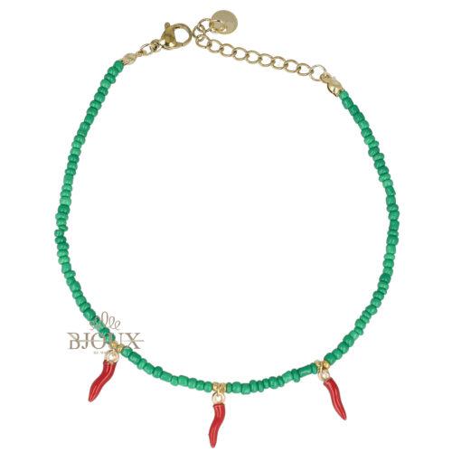 Cavigliera con chiusura in acciaio inossidabile con micro corallini colorati e tre corni rossi pendenti
