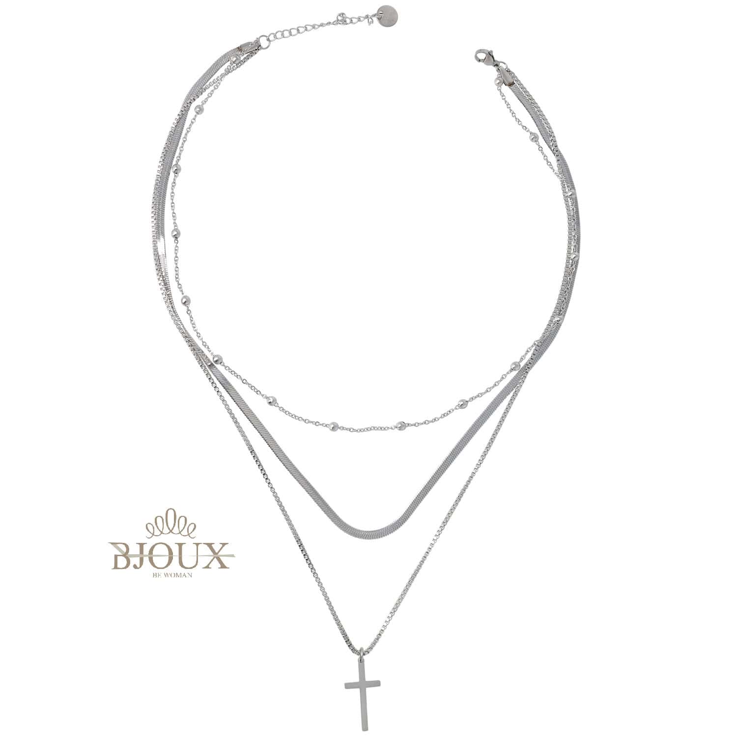 Collana da donna a tre fili in acciaio inossidabile con croce pendente. Colore rodio.