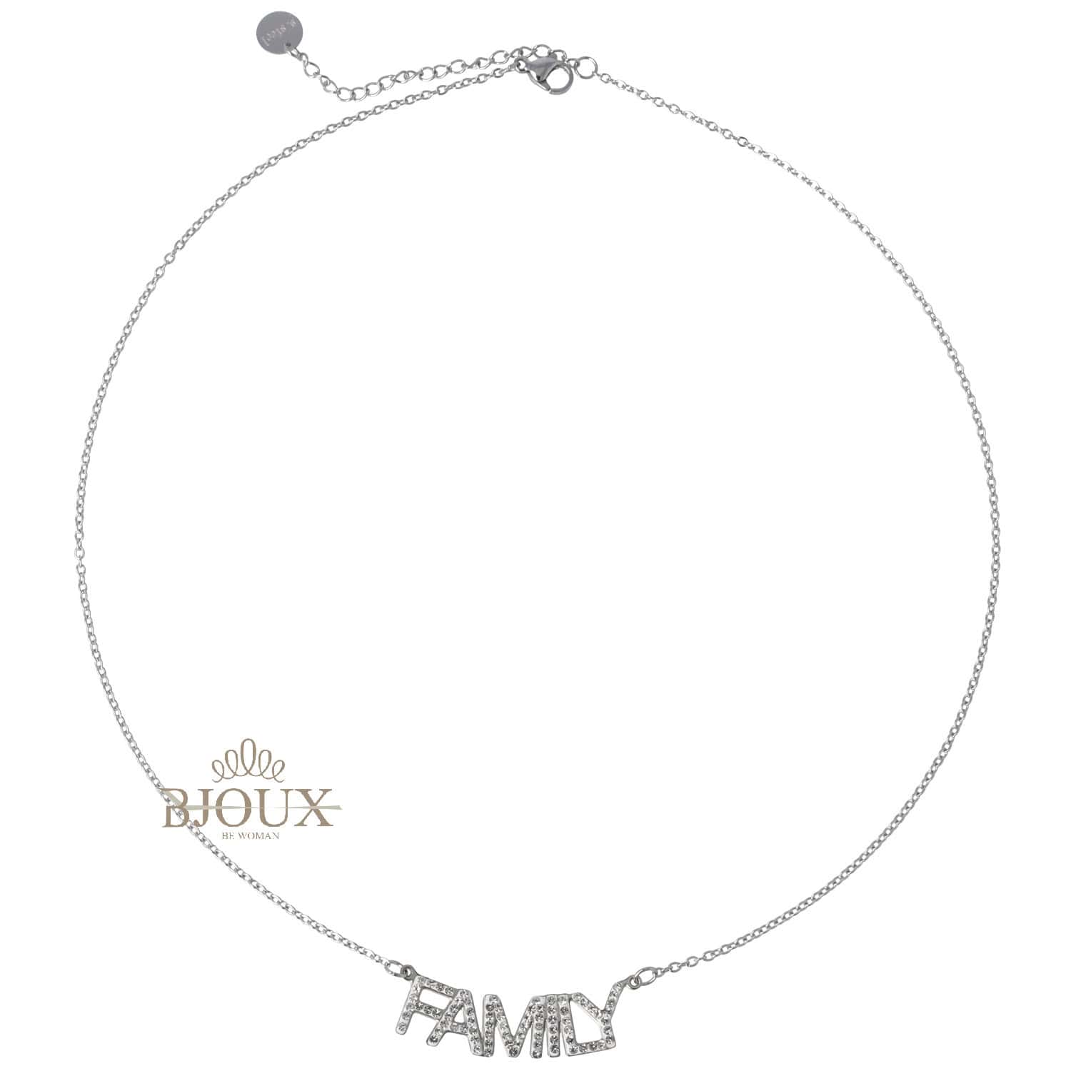 Collana bigiotteria in acciaio inossidabile colore rodio con centrale scritta family con zirconi.
