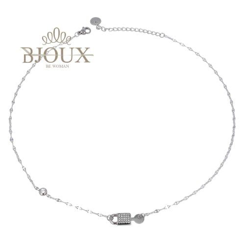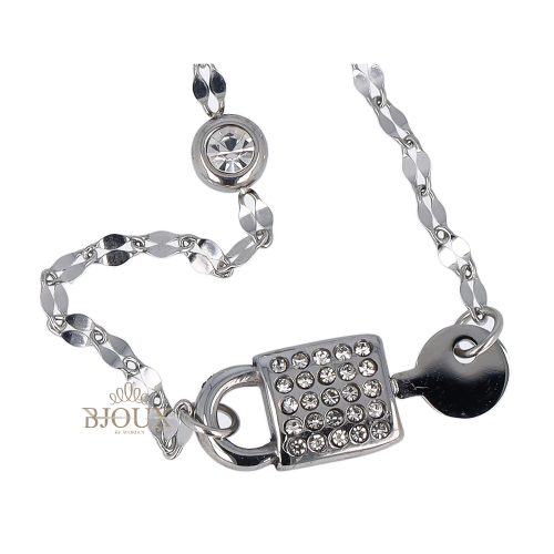 Collana catenina a girocollo in acciaio inossidabile con punto luce, chiave e lucchetto decorato da zirconi.