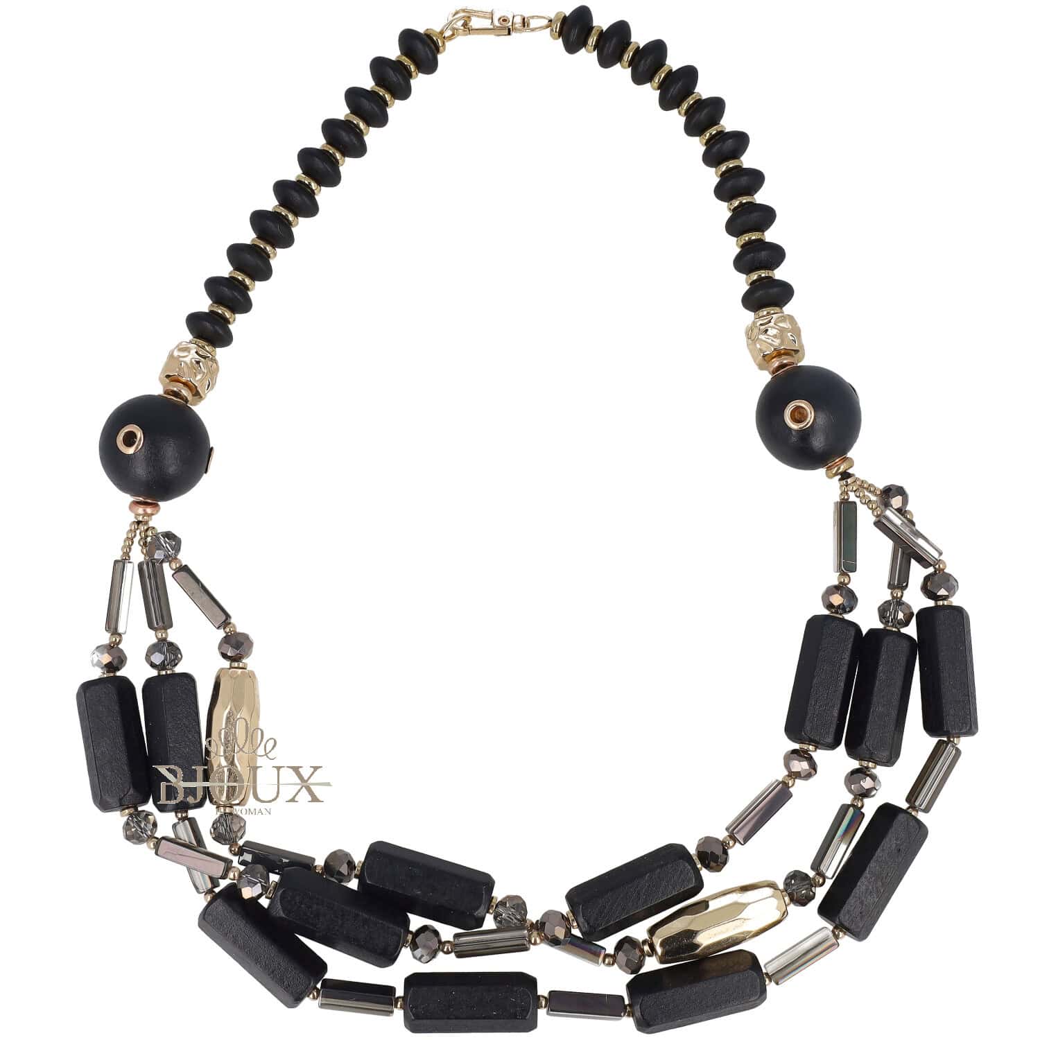 Collana con elementi geometrici neri e cristalli metallici. Decisa e glamour, ideale per outfit eleganti e urban.