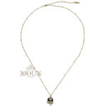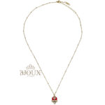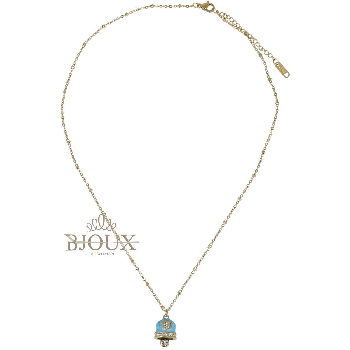 Collana donna con ciondolo campanella.ย Collana con catenina sottile maglia a sfere alternate a piccoli anellini tipo catena rosario. Al centro pende una campanella in stile Capri, smaltata ย e decorata con unย cuore composto da piccoli strass