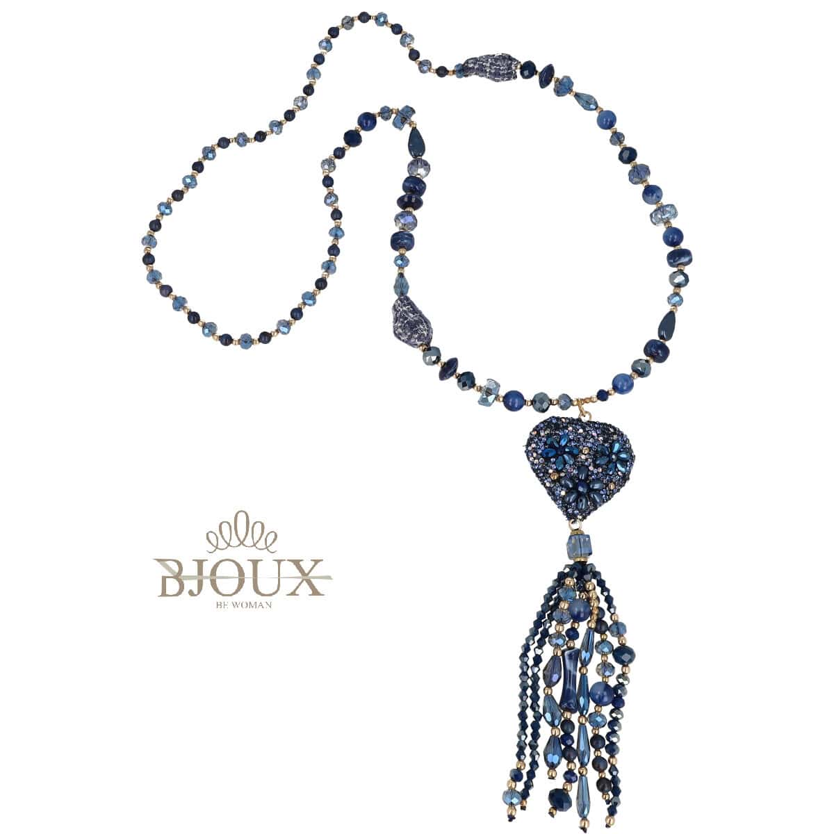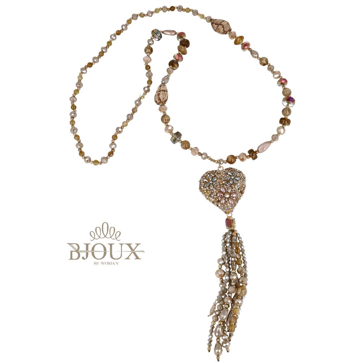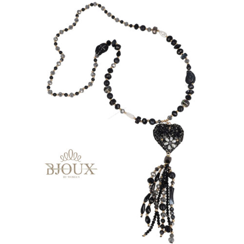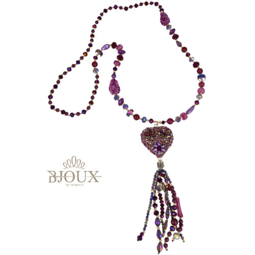 Collana lunga con pietre multicolore a gradazione , con cuore centrale decorato da cristalli, pietre e fiori arricchita da ciuffi pendenti. Tono brillante e femminile per look moderni e luminosi.