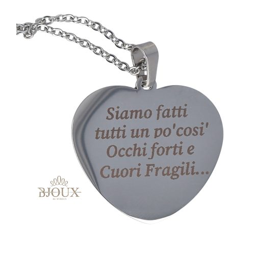 Collana in acciaio inossidabile a catena e charms cuore pendente da 2,5 cm. Frase “Siamo fatti un pò così, occhi forti e cuori fragili”