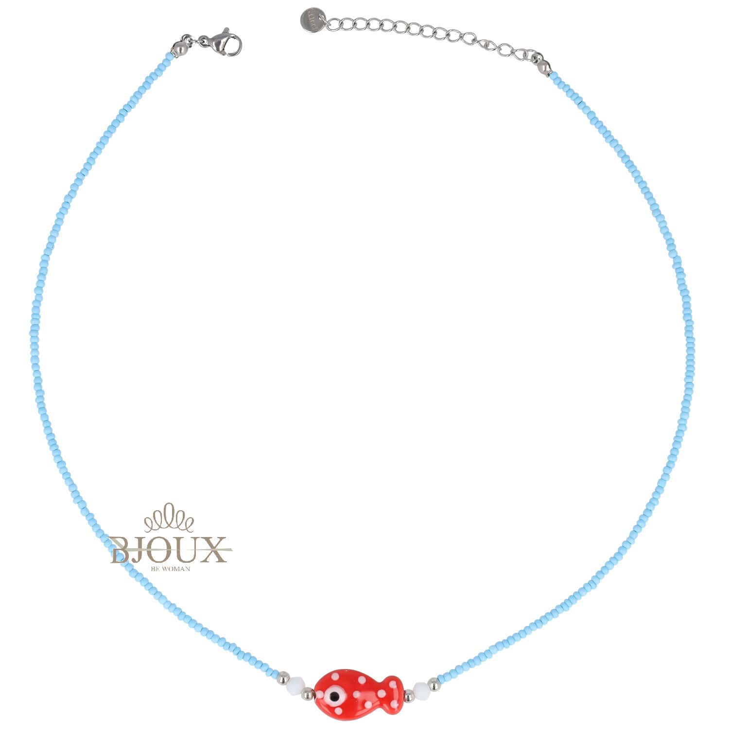 Collana a girocollo con estensione in acciaio inossidabile composta da corallini colorati con pesciolino centrale