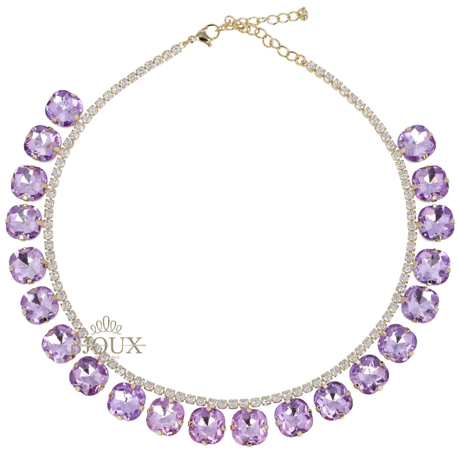 Collana da donna in ottone impreziosita da una cascata di cristalli tondi colorati che catturano la luce ad ogni movimento. La base in ottone dorato e la fila superiore di strass trasparenti creano un contrasto raffinato e sofisticato. Chiusura con moschettone con catenella regolabile – 3+8 cm